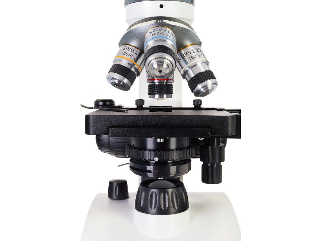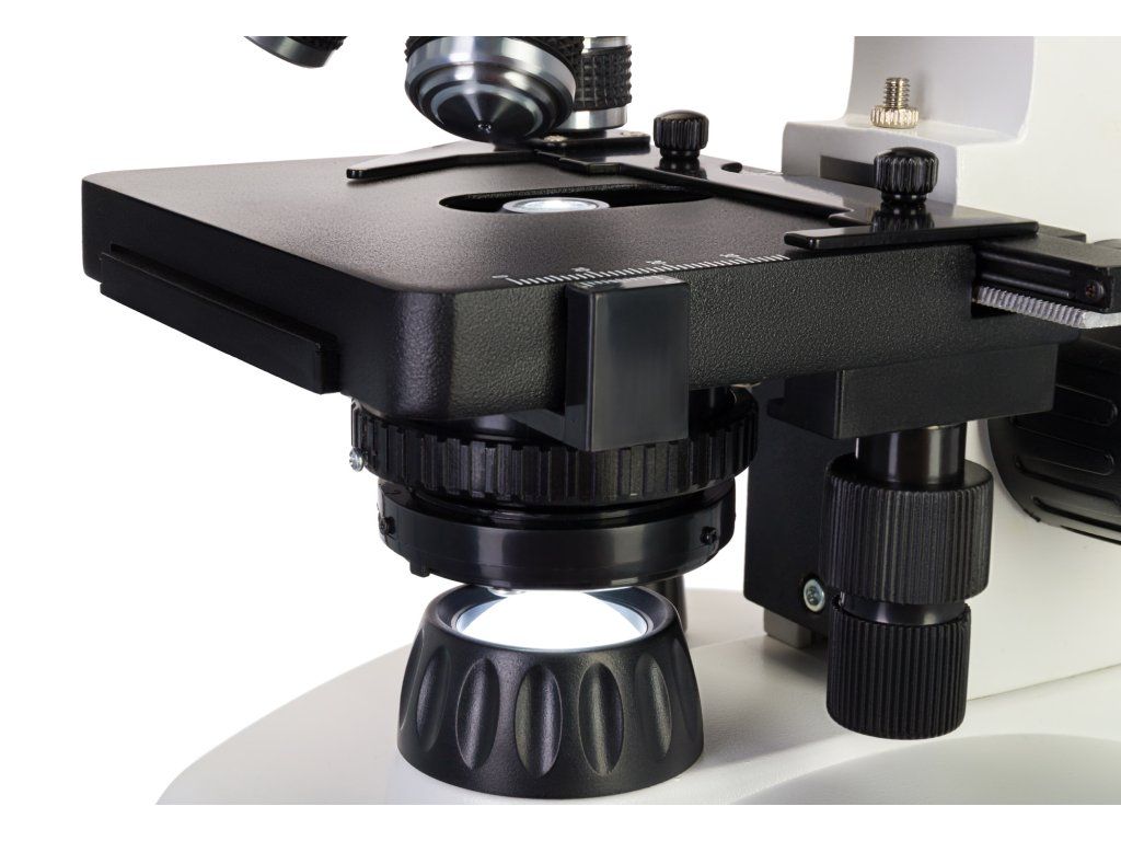 Pre pohodlie práce s mikroskopickými preparátmi je pracovný stolík vybavený mechanickou stupnicou. Osvetlenie tvoria dve LED diódy, ktorých jas je možné regulovať. Jedna LED dióda je hore, druhá je dole. Obidve môžu byť napájané buď batériami, alebo striedavý prúdom (sieťový adaptér je súčasťou balenia). Mikroskop má aj Abbeov kondenzor s irisovou clonou a držiakom filtra.
