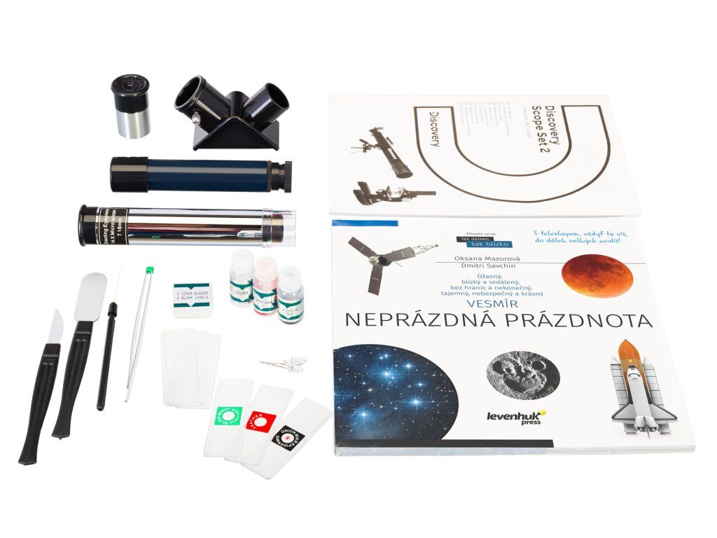 Sada Discovery Scope 2 obsahuje dva optické prístroje naraz: mikroskop a hvezdársky ďalekohľad. Mikroskop vám pomôže zvládnuť základy mikrobiológie, hvezdársky ďalekohľad – zoznámiť sa so základmi astronómie. Okrem týchto zariadení obsahuje sada mnoho doplnkov, ktoré budú potrebné na výskum okolitého sveta a vykonávanie vedeckých experimentov. Sada je doplnená aj vzdelávacou knihou „ Vesmír. Neprázdna prázdnota.“ – je to bohato ilustrovaná príručka, ktorá rozpráva o teleskopoch a astronomických objektoch.