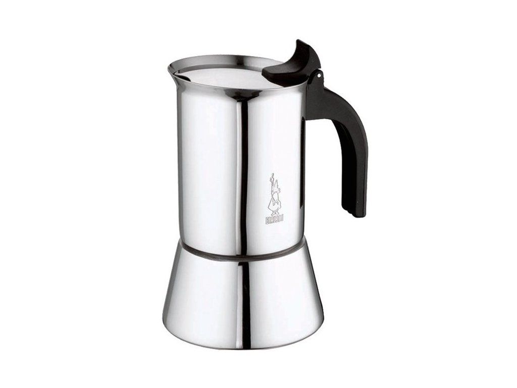 Elegantný dizajnový moka kávovar Bialetti Venus na 6 šálok, má masívne telo z nerezovej ocele 18/8 s lesklým povrchom. Rukoväť je z tepluvzdorného plastu.