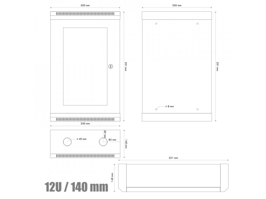 DATACOM 10'' nástěnný rozvaděč 12U/140mm * svařovaný skelet rozvaděče o síle 1,5mm (ocelový plech) * zamykatelné plechové dveře s plexisklo výplní * nastavitelná hloubka předních vertikálních lišt * v horní/spodní části rozvaděče perforace pro odvětrání * vylamovací záslepky pro vstup kabelu * otevření dveří možné až po úhel 225° * snadná výměna levé/pravé otevírání * 4 předvrtané otvory pro uchycení na zeď * maximální doporučená využitelná hloubka rozvaděče 100mm Specifikace Stupeň krytí: IP20 Maximální doporučené zatížení: 15kg Barva: černá Rozměry: 551x350x140mm Hmotnost: 5,4kg Rozvaděč obsahuje: * přední posuvné 12U vertikální lišty * dveřní zámek + 2x klíčDodatočné parametre