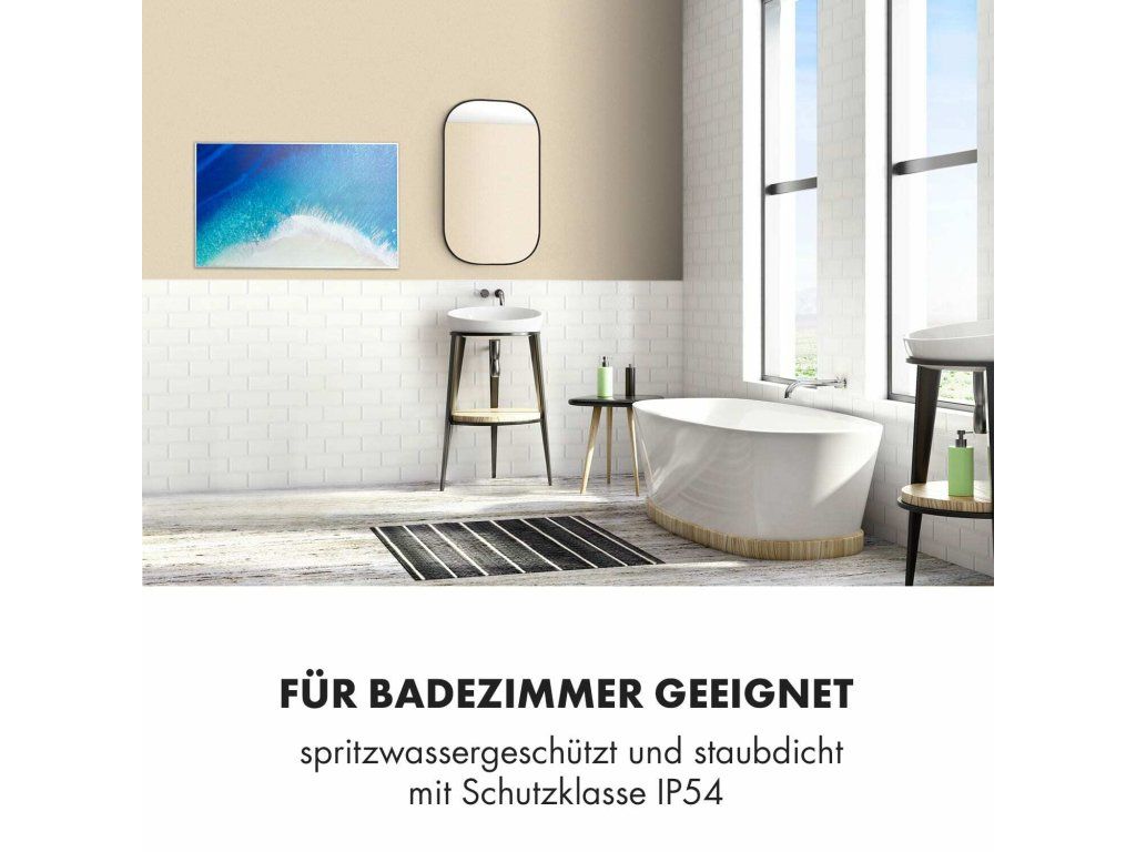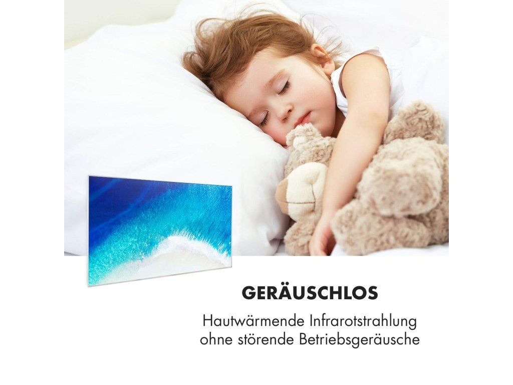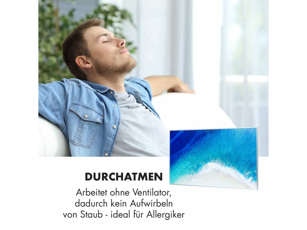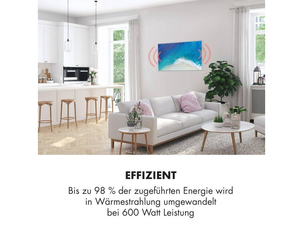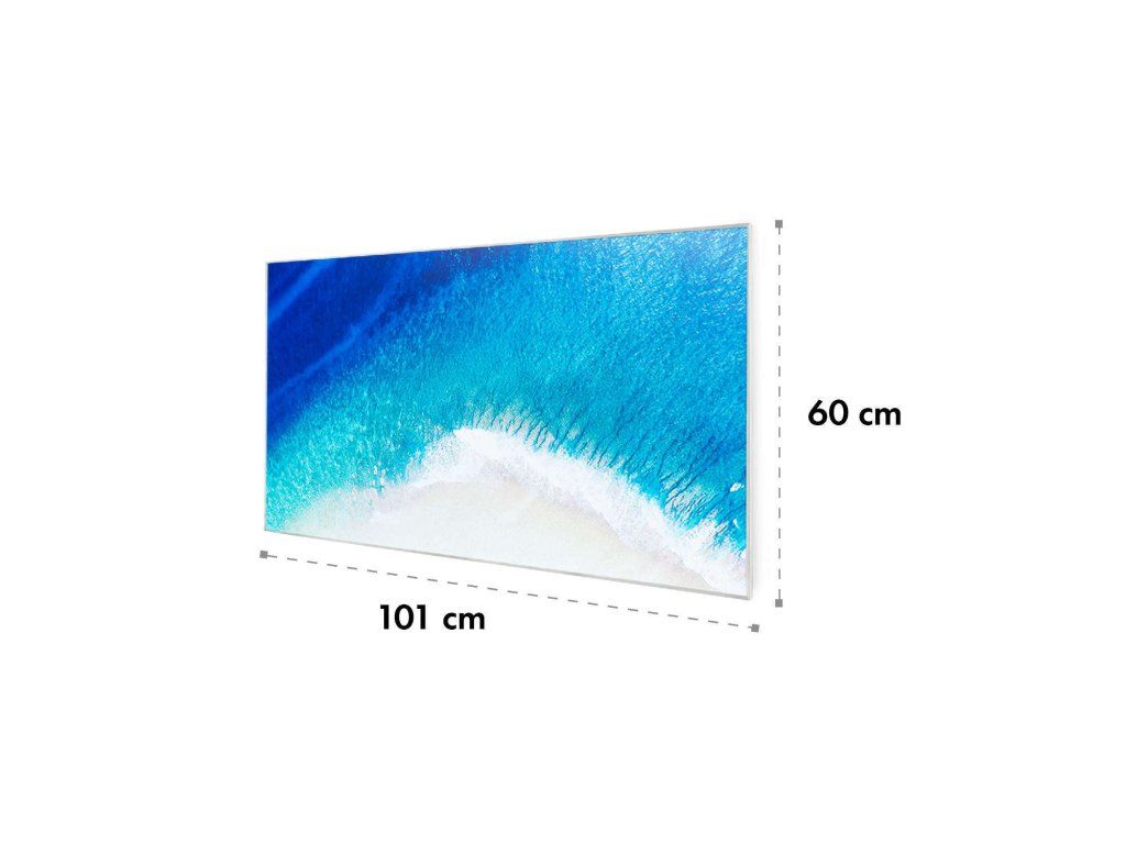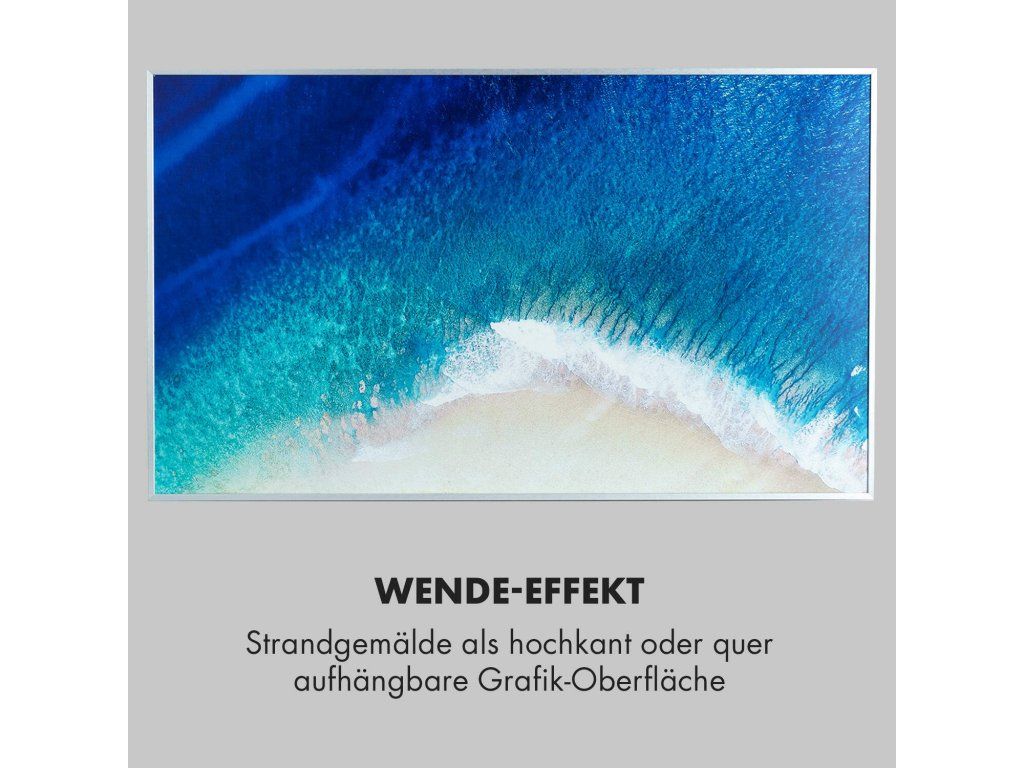 Najnovšia technológia na vytvorenie príjemného tepla: infračervený ohrievač Klarstein Wonderwall Air Art 60 prináša teplo do každej miestnosti veľmi efektívnym a priestorovo úsporným spôsobom a zároveň prináša do miestnosti aj nový lesk a farby so svojím grafickým dizajnovým povrchom. Obraz s plážovou maľbou sa dá zavesiť na výšku aj na šírku.Infračervený ohrievač Klarstein Wonderwall Air Art 60 predstavuje revolúciu vo vykurovaní vďaka modernej technológii. Veľmi plochý výhrevný panel s veľkosťou 60 x 101 cm možno zavesiť priamo na stenu, vďaka čomu predstavuje maximálne priestorovo úsporné vykurovacie riešenie. S výkonom 600 W šíri k ľudskej pokožke veľmi príjemné infračervené teplo, ktoré je vyžarované cielene na osoby v blízkosti ohrievača. Vykurovací panel je zároveň veľmi energeticky úsporný: vďaka použitiu technológie CarbonCrystal Infrared sa až 98 % výkonu premieňa na tepelné žiarenie.S termostatom a premyslenými funkciami, ako sú funkcia automatického vypnutia a detekcia otvoreného okna OpenWindow Detection, splní infračervený ohrievač aj tie najnáročnejšie požiadavky. Nastaviteľný týždenný časový spínač umožňuje programovanie časov kúrenia na každý deň týždni. Zariadenie Wanderwall pracuje bez ventilátora, nevíri prach, a preto je toto vykurovacie zariadenie ideálnou voľbou pre alergikov. Vďaka svojmu plochému dizajnu, rýchlemu tepelnému výkonu a priestorovo úspornej montáži na stenu je ohrievač obzvlášť vhodný na použitie v kúpeľni. Preto je zariadenie Wonderwall Air Art 60 s triedou ochrany IP54 úplne chránené proti striekajúcej vode.Spustenie ohrievača je extrémne jednoduché: panel zavesíte na stenu a následne ho len zapojíte do elektrickej zásuvky. Séria vykurovacích panelov Klarstein Wonderwall Air má pre pohodlnú obsluhu bezdrôtový diaľkový ovládač, pomocou ktorého sa dajú obsluhovať všetky funkcie.Budúcnosť vykurovacej techniky: infračervený ohrievač Klarstein Wonderwall Air Art 60.Najväčšie výhody: