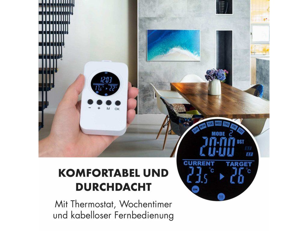 - Pohodlný a premyslený: s termostatom, týždenným časovým spínačom a bezdrôtovým diaľkovým ovládačom
