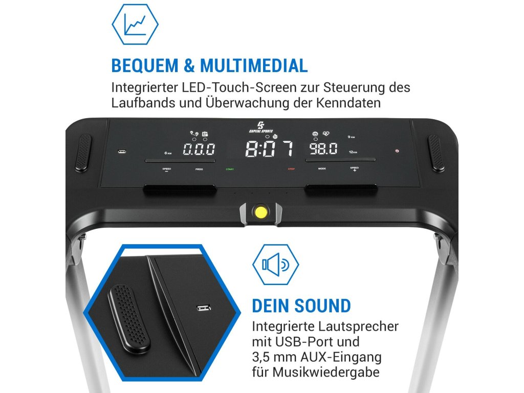 - pohodlný a multimediálny: zabudovaný LED dotykový displej na ovládanie bežeckého pásu a sledovanie technických parametrov