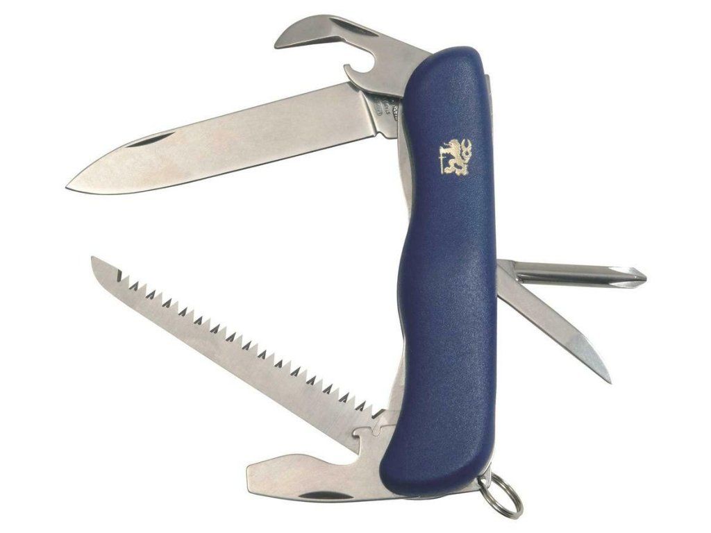 Má čepeľ s hladkou hranou z nehrdzavejúcej ocele 420, otvára sa manuálne a zaisťuje ju Linerlock. Rukoväť je z modrého odolného plastu s motívom leva, v spodnej časti má krúžok na zavesenie.