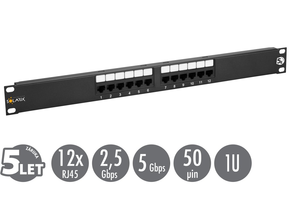 19'' patch panel Solarix 12 x RJ45 CAT5E UTP 150 MHz čierny 1U SX12-5E-UTP-BK
