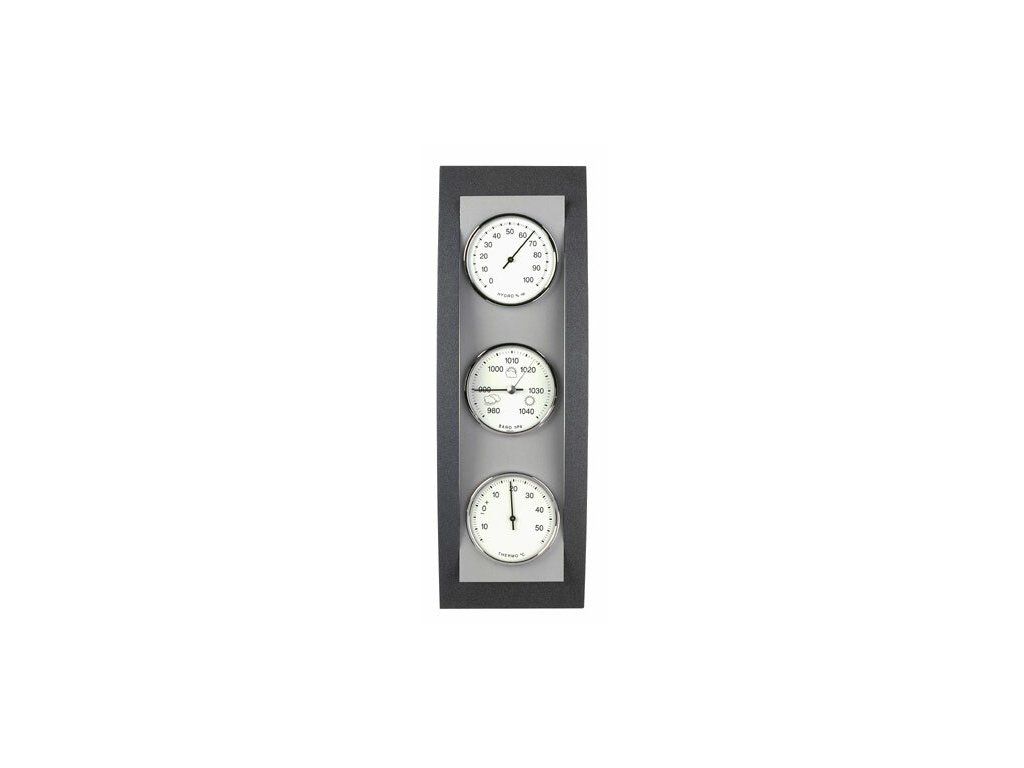 Meteostanica TFA 20.1082.17 obsahuje barometer, vlhkomer a teplomer, prístroje majú priemer Ø 81 mm. Materiál je buk a hliník.