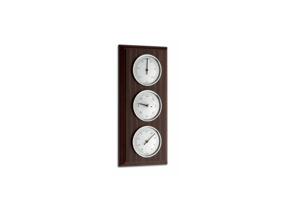 Analógová meteostanica TFA 20.1088 z orechového dreva obsahuje barometer, teplomer a vlhkomer.