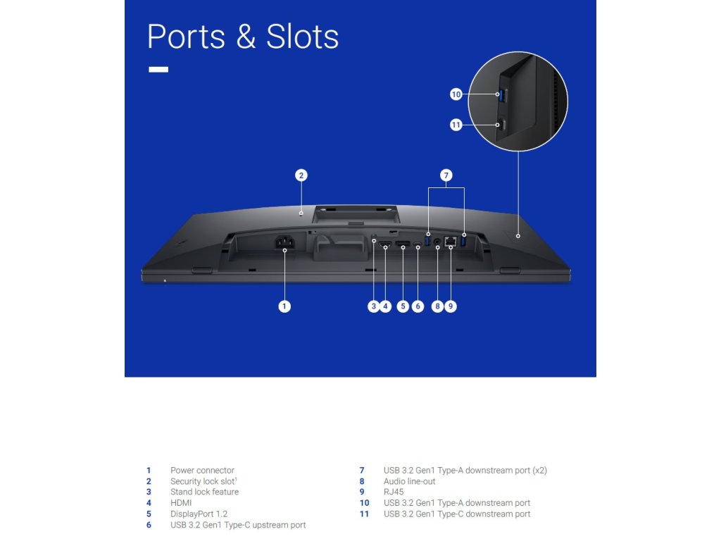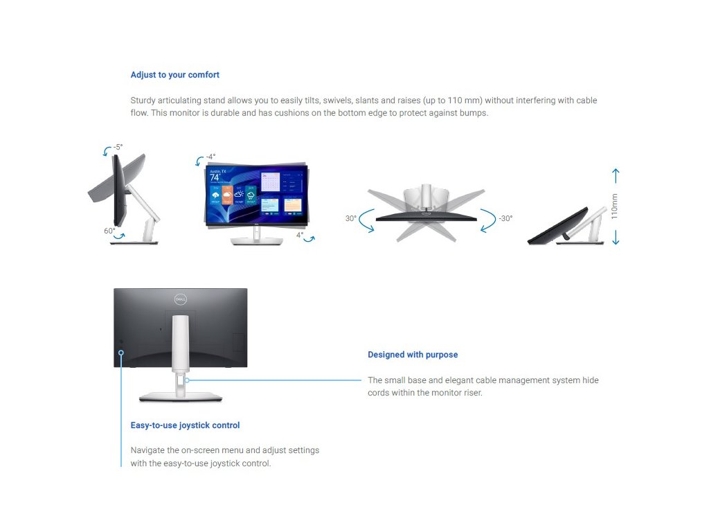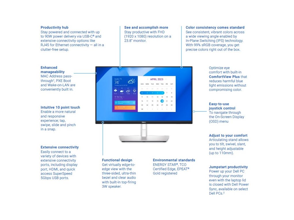 Technická specifikace: MODEL: P2424HT - Dell 24 Touch USB-C Monitor DIAGONAL VIEWING SIZE: 60.47 cm (23.8 inches) PANEL TYPE: In-Plane Switching (IPS) technology VIEWING ANGLES: 178° vertical / 178° horizontal DISPLAY SCREEN COATING: Anti-glare treatment of the front polarizer (3H) hard coating MAXIMUM PRESET RESOLUTION: Full HD (1920 x 1080) at 60 Hz ASPECT RATIO: 16:9 PIXEL PITCH: 0.2745 mm x 0.2745 mm PIXEL PER INCH (PPI): 93 BRIGHTNESS: 300 cd/m2 (typ) CONTRAST RATIO: 1,000:1 (typical) BACKLIGHT TECHNOLOGY: LED edgelight system RESPONSE TIME: 5ms gray to gray (fast), 8ms gray to gray (normal) COLOR GAMUT: 99% sRGB COLOR DEPTH: Up to 16.78 million LOW BLUE LIGHT: Yes, TÜV-certified ComfortView Plus FLICKER-FREE: Yes, TÜV-certified Flicker-free INTERFACES: 1x HDMI1 (HDCP 1.4) 1x DP 1.2 (HDCP 1.4) 1x RJ45 1x Audio line-out (3.5mm jack) 1x USB 3.2 Gen1 Type-C (with up to 90W PD) 2x USB 3.2 Gen1 Type-A downstream 1x USB 3.2 Gen1 Type-C downstream (with up to 15W PD) 1x USB 3.2 Gen1 Type-A downstream (with BC1.2 up to 10W) ADJUSTABILITY: Height, swivel, slant, and tilt HEIGHT ADJUSTMENT: Up to 110.52mm (4.35 inches) SWIVEL ANGLE: -30° / 30° SLANT ANGLES: -4° / 4° TILT ANGLES: -5° / +60° VESA MOUNTING INTERFACE: 100mm x 100mm TOUCH FUNTIONALITY: 10-point touch for WinOS and MacOS, 3-point touch for Linux AUDIO: 1x 3W mono PRODUCTIVITY SOFTWARE SUPPORT: DDM with Dell Easy Arrange SECURITY LOCK SLOT: Yes, based on Kensington Security Slot™ OTHERS: Dell Power Button Sync (DPBS) VOLTAGE REQUIRED: 100 VAC to 240 VAC / 50 Hz or 60 Hz ± 3 Hz / 2.0 A (typ) POWER CONSUMPTION: 0.3W (Off mode), 0.5W (Standby mode), 18W (On mode), 190W (Max) ENERGY EFFICIENCY CLASS (A TO G SCALE): E DIMENSIONS (H x W x D) - FULL MONITOR: 320.98 mm x 538.80 mm x 248.87 mm, (12.64 inches x 21.21 inches x 9.80 inches) DIMENSIONS (H x W x D) - PANEL ONLY (FOR VESA MOUNTING): 320.98 mm x 538.80 mm x 54.10 mm, (12.64 inches x 21.21 inches x 2.13 inches) WEIGHT - FULL MONITOR: 7.86 kg (17.33 lbs) WEIGHT - PANEL ONLY (FOR VESA MOUNTING): 3.86 kg (8.51 lbs) ENERGY STAR® CERTIFIED: Yes EPEAT COMPLIANT: Gold TCO CERTIFIED: TCO 9 and TCO Certified Edge RoHS COMPLIANT: Yes TEMPERATURE RANGE: Operating: 0°C ~ 40°C (32°F ~ 104°F) HUMIDITY RANGE: Operating: 10% ~ 80% (non-condensing) WHAT’S INCLUDED: 1x Monitor panel 1x Stand riser 1x Stand base 1x Cable cover 1x Power cable 1x DP 1.2 cable, DP-to-DP (1.8m) 1x USB 3.2 Gen1 Type C-to-C upstream cable (1.8m) 1x USB 3.2 Gen1 Type C-to-A upstream cable (1.8m) 1x Quick setup guide 1x Safety, Environmental, and Regulatory Information STANDARD WARRANTY: 3-year Limited Hardware Warranty with Advanced Exchange Service and Premium Panel Exchange. odkaz na stránky výrobce: https://www.dell.com/en-us/shop/dell-24-touch-usb-c-hub-monitor-p2424ht/apd/210-bhsf/monitors-monitor-accessoriesDodatočné parametre