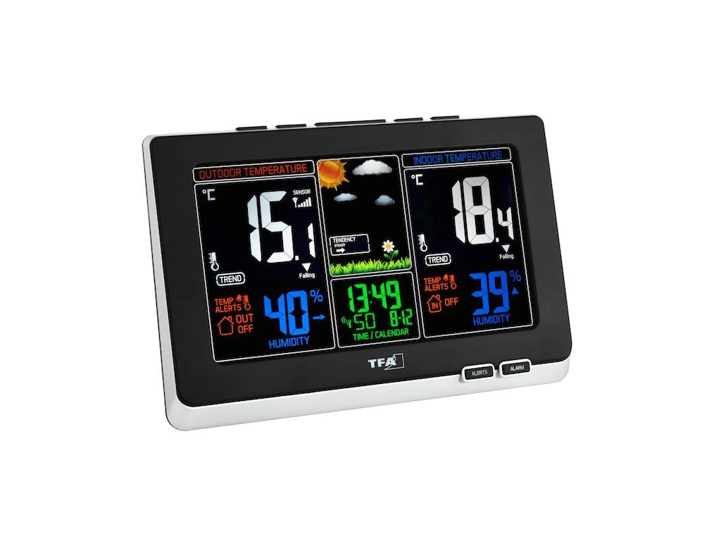Domáca bezdrôtová meteostanica TFA Spring 35.1129.01 s farebným displejom, ktorého maximálny jas možno regulovať.