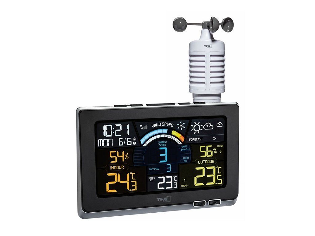 Bezdrôtová meteostanica TFA 35.1140.01 Spring Breeze, ktorá meria okrem základných hodnôt (teplota, vlhkosť a tlak vzduchu) aj rýchlosť vetra. Vďaka tomu je schopná spočítať napr. aj vonkajšiu pocitovú teplotu a hodnotu Wind chill. Tá súvisí s tým, že našu pocitovú teplotu výrazne znižuje vietor. Wind chill je počítaný len pre teploty nižšie ako 10 °C a rýchlosti vetra nad 1,3 m/s.