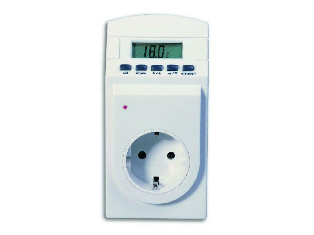Teplotný časovač TFA 37.3000 v modernej bielej farbe na použitie v zástrčke. Je vybavený káblom s dĺžkou 1 m a maximálnym spínacím výkonom 3500 W.