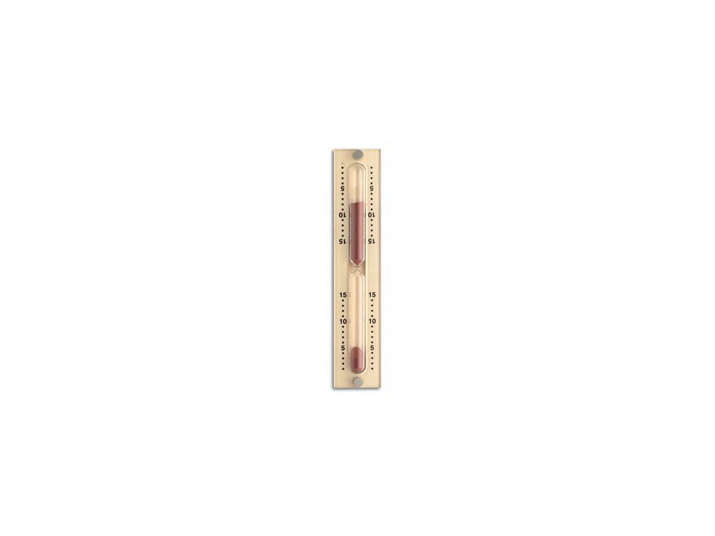 Saunové sklenené presýpacie hodiny TFA 40.1045.15 s podkladom z kvalitného javorového dreva s dekoratívnym plastovým priehľadným krytom. Skrutky pre pripevnenie na stenu sú súčasťou balenia. Meraný čas je orientačný.