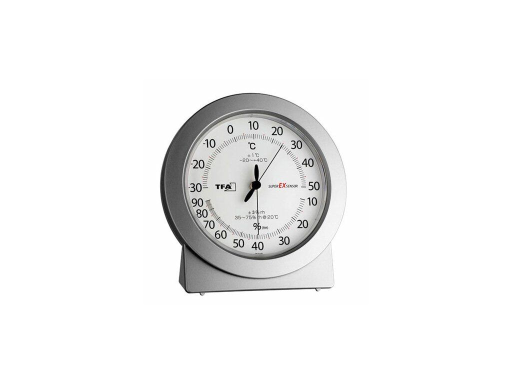 Stolný analógový teplomer s vlhkomerom TFA Super-ex-Sensor 45.2020 pre zvlášť presné a rýchle meranie, presnosť merania teploty ±1°C od -20...+40°C, vlhkosti ±3% od 35...70% pri 20°C.