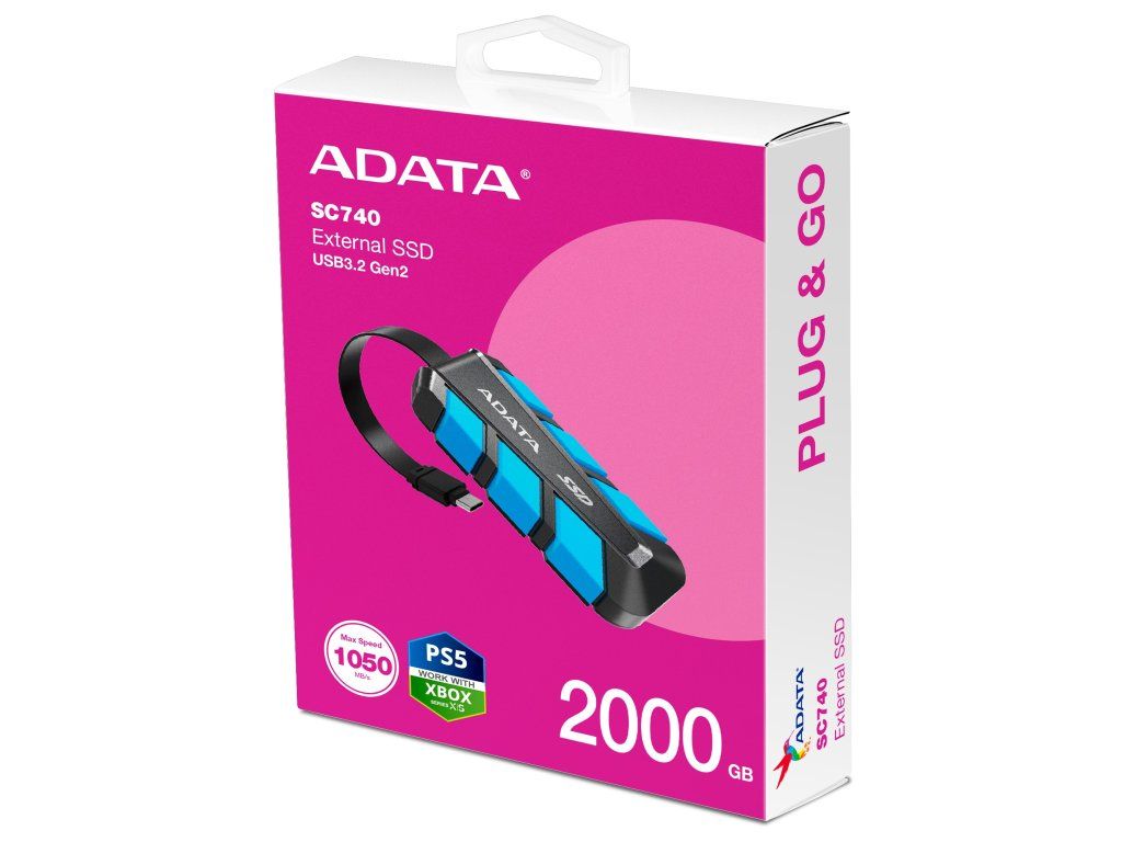 B>Externí SSD disk/USB flash SC740 Jednotka SC740 podporuje vysokorychlostní přenos přes rozhraní USB 3.2 Gen2 s rychlostmi čtení/zápisu až 1050/1000 MB/s a šířkou přenosového pásma až 10 Gb za sekundu. Velké soubory lze upravovat a otevírat přímo na jednotce SC740, která také podporuje přenos souborů s telefony řady iPhone 16 nebo přímý záznam videí Apple ProRes s nejvyššími typy modelů telefonů iPhone, takže je práce s ní vždy hladká a bez potíží. Jednotka SC740 obsahuje integrovaný přenosový kabel USB-C a kabelovou svorku pro snadné ukládání a přenosnost. Používání externí jednotky SSD nebylo ještě nikdy tak intuitivní a praktické. *Integrovaný přenosový kabel USB-C *Odolnost proti nárazu při pádu z výšky 1,22 m dle MIL-STD-810G 516.6 *Podporuje nejnovějších generaci herních konzolí (PS5, XBOX) Rozhraní: USB 3.2 Gen 2 (10Gbps) (zpětně kompatibilní s USB 2.0) Rychlost čtení: až 1050 MB/s Rychlost zápisu: až 1000 MB/s Barva: modrá Rozměry: 121,75 x 40,5 x 22,3 mm Délka kabelu: 127 mm Váha: 40g Operační systém: Windows 10/11, macOS 13 nebo novější (je nutné formátování), Linux Kernel 6 nebo novější, Android 13 nebo novějšíDodatočné parametre
