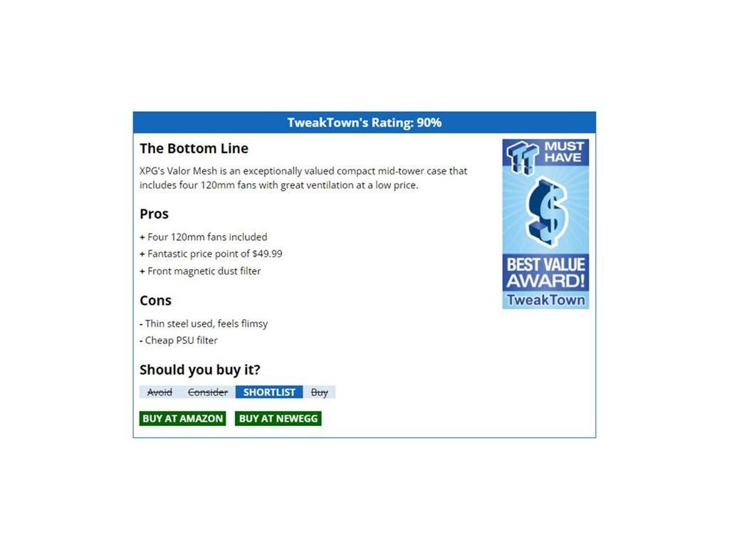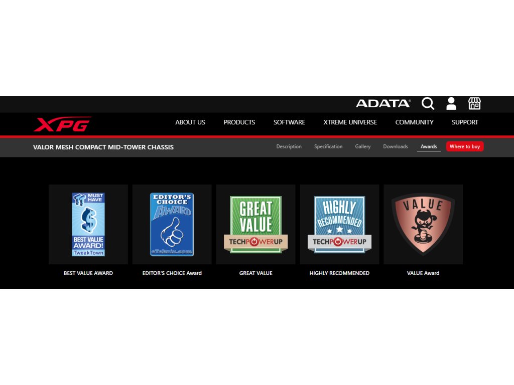 Adata XPG VALOR MESH * vyjímatelný prachový filtr * přední odnímatelný magnetický panel Typ: Midi Tower Podporuje základní desky: ATX, microATX, mini-ITX Pole pro disková úložiště: * 2x 3,5“ HDD * 2x 2,5'' SSD * 1x 2,5/3,5'' SSD/HDD Externí porty: * 2x USB 3.2 Gen 1 * 1x 3,5mm kombinovaný audio/mikrofonní konektor Podpora pro přídavné chlazení: * přední: chladič 360/280/240mm, ventilátor 3x 120mm, 2x 140mm * horní: chladič 240mm, ventilátor 2x 120mm, 2x 140mm * zadní: chladič 120mm, ventilátor 1x 120mm Předinstalované ventilátory: * vpředu: 3x 120mm * vzadu: 1x 120mm Bočnice: 1x 3mm tvrzené sklo (levá strana) Maximální výška chladiče CPU: 166mm Maximální délka PSU: 160-180mm (s držákem HDD/SSD) Maximální délka GPU: 335mm (305mm s předinstalovanými ventilátory) Materiál: SPCC Barva: černá Rozměry: 460x210x371mm Záruka: 2 roky Odkaz na stránku výrobce: https://www.xpg.com/cz/xpg/pc-component-valor-mesh-compact-mid-tower-chassis Recenze: XPG Valor Mesh Mid-Tower ATX Case Review (tweaktown.com)Recenze: https://www.eteknix.com/xpg-valor-mesh-case-review/Recenze: https://www.techpowerup.com/review/xpg-valor-mesh/Dodatočné parametre