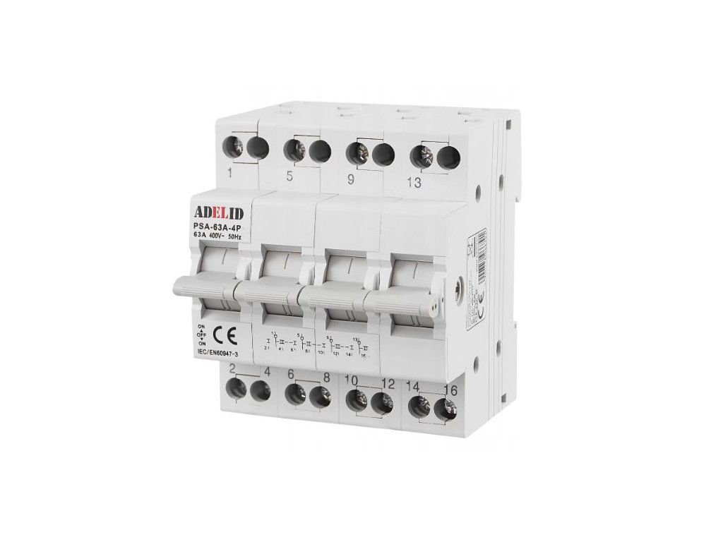 Adelid PSA-63A-4P Prepínač pre výber napájania 32A, 1-0-2, 4PPrepínač sieťového napätia sa používa v riadiacich systémoch.