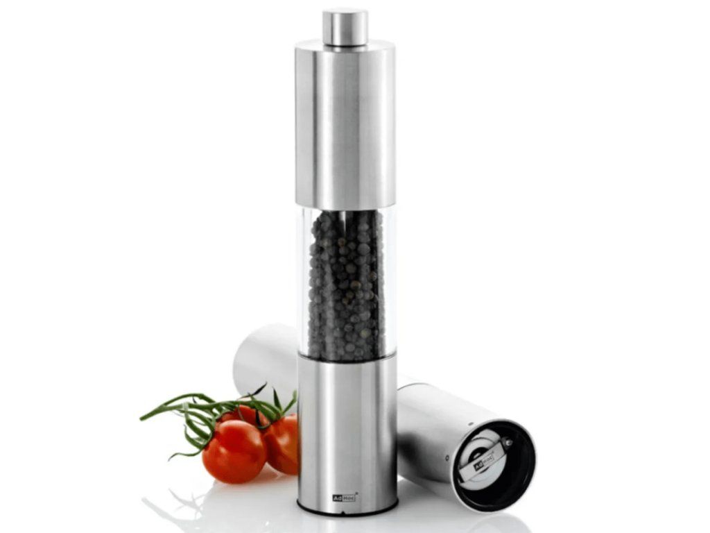 Klasický priehľadný ručný mlynček na korenie a soľ AdHoc Classic Large vyrobený z kombinácie nerezovej ocele a akrylu. S kvalitným odolným mlecím mechanizmom CeraCut® a vďaka nemu zostávajú bez zápachu. S vrchnou skrutkou možno nastaviť hrubosť mletia.