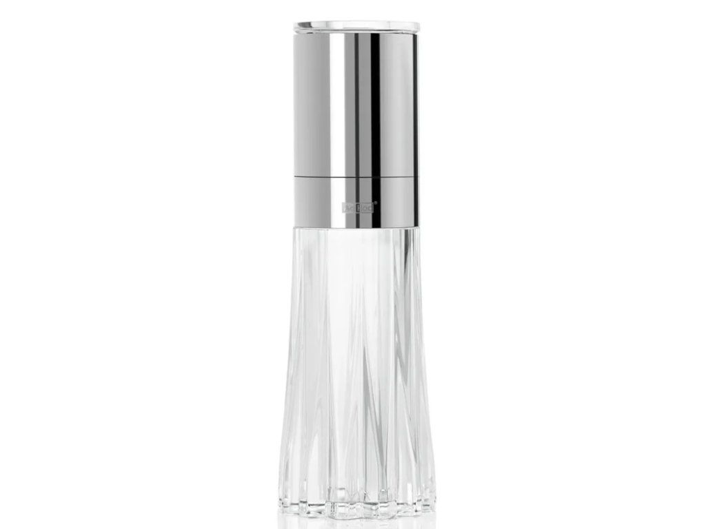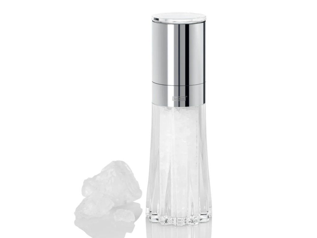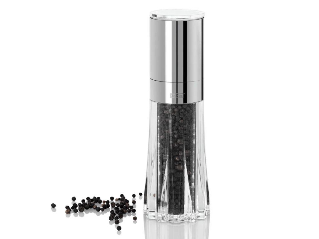 Mlynček na korenie a soľ AdHoc CRYSTAL s čírim moderným dizajnom, vyrobený z kombinácie akrylu a nerezovej ocele, s patentovaným keramickým mlecím mechanizmom CeraCut®.