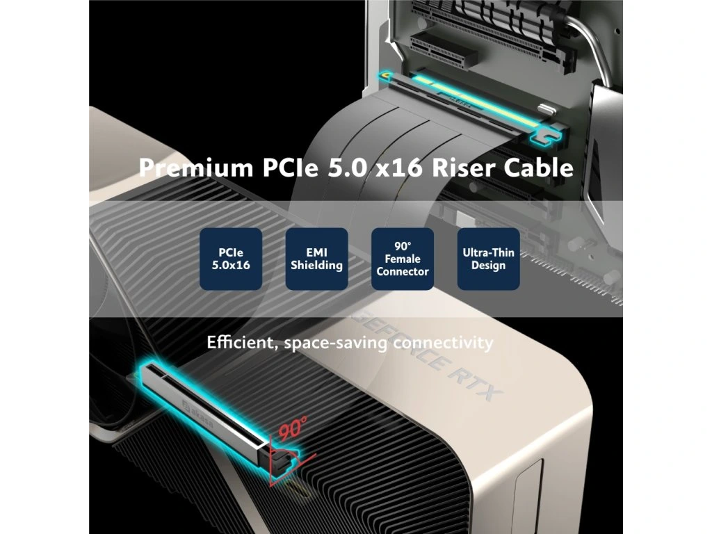 AKASA RISER BLACK X3 Mark V * Ultra-vysokorychlostní PCIe 5.0 šířka pásma až 128 GB/s * Výkonné EMI stínění * Maximální flexibilita * Vynikající design PCB Obecné informace: * Aplikace: Prémiový stoupací kabel PCIe 5.0 x16 * Délka: 300 mm * Barva: Černý * Konektor: 180° PCIe 5.0 x16 samec až 90° PCIe 5.0 x16 samiceDodatočné parametre