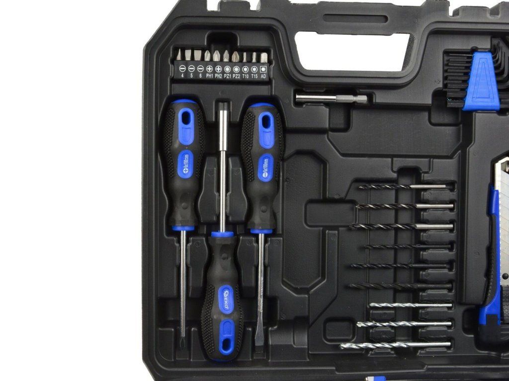 sady bitů, 1/4 "nástrčných hlavic, šroubováků, vrtáků, imbusových klíčů, nastavitelného klíče, kleští, ulamovacího nože a metru.