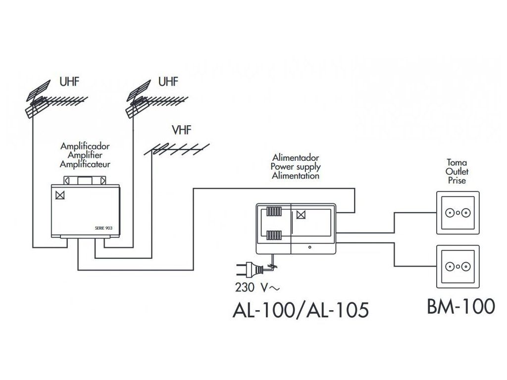 Zdroj Alcad AL-105 pro napájení zesilovačů (AM) na 12V. Má v sobě integrovanou napájecí vyhýbku a na výstupu širokopásmový rozbočovač. Součástí je přívodní šňůra do zásuvky.