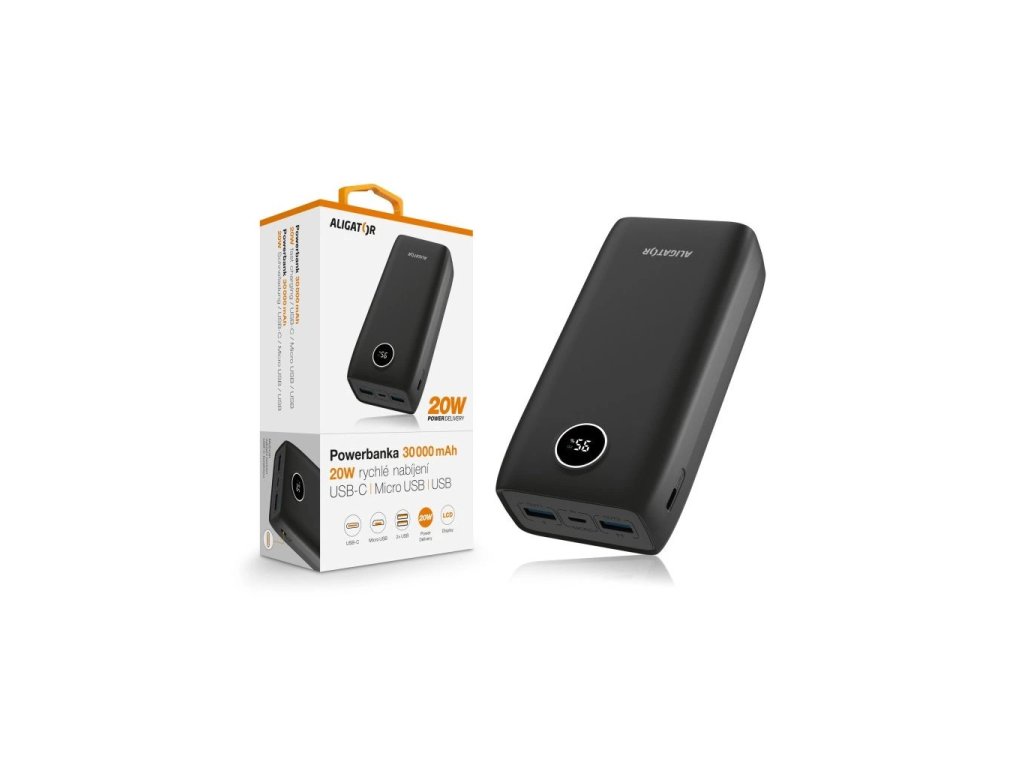 Powerbanka ALIGATOR Power Delivery 20W, rychlé nabíjení, 30 000 mAh, černá Dopřejte si pohodlí a jistotu s naší powerbankou o kapacitě 30 000 mAh, která Vás nikdy nenechá na holičkách. Ať už jste na cestách, v práci nebo venku, s touto tenkou a elegantní powerbankou budete mít vždy energii po ruce. Díky podpoře rychlého nabíjení o výkonu 20 W se Vaše zařízení nabijí v rekordním čase, a to prostřednictvím portů USB-C, Micro USB nebo klasického USB. Powerbanka je vybavena praktickým displejem, který Vám okamžitě ukáže stav zbývající baterie, takže vždy budete přesně vědět, kolik energie Vám zbývá. Její tenký a lehký design umožňuje snadné přenášení, ať už ji schováte do kapsy, kabelky nebo batohu. Bezpečnost je zaručena díky nadproudové ochraně, ochraně proti přepětí a zkratu, což zajišťuje spolehlivé a bezpečné nabíjení Vašich zařízení. S touto powerbankou se již nemusíte obávat vybitých baterií v kritických momentech – jednoduše se postará o to, abyste byli vždy připojeni a plní energie.Dodatočné parametre