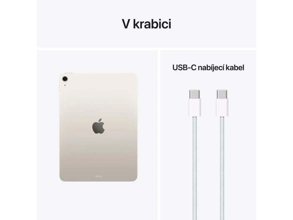 Apple iPad Air 11'' (M4) Wi-Fi 256GB *Apple Intelligence Operační systém: iPadOS 26 Procesor: Apple M4, 8 jádrové CPU (3P+5E), 9 jádrové GPU, 16 jádrový Neural Engine Paměť: 12GB Pevný disk: ,256GB Čtečka paměťových karet: ne Displej: 10,86'' Liquid Retina Multi-Touch displej s LED podsvícením a technologií IPS, 2360x1640 při 264ppi, 500 nitů, antireflexní, oleofobní úprava proti šmouhám, True Tone Audio: stereo reproduktory v orientaci na šířku, FaceTime audio, 2x mikrofon Zadní fotoaparát: *12MP širokoúhlý, f/1,8, pětičlenný objektiv, až 5× digitální zoom, Smart HDR 4, sekvenční režim, HEIF a JPEG *4K video při 24 fps, 25 fps, 30 fps nebo 60 fps, kontinuální autofokus při nahrávání videa, HEVC a H.264, časosběrné video se stabilizací Přední webkamera: *12MP Center Stage na šířku, f/2,0, Smart HDR 4 *1080p HD video při 25 fps, 30 fps nebo 60 fps, Retina Flash s True Tone, sekvenční režim, FaceTime Senzory: *Touch ID *tříosý gyroskop *akcelerometr *barometr *snímač okolního osvětlení Určování polohy: *digitální kompas *Wi-Fi *mikrolokalizace iBeacon Bezdrátová komunikace: Wi-Fi 7 (802.11be) s technologií 2×2 MIMO + Bluetooth 6 Porty: *1x USB-C (až 10 Gb/s), nabíjení, DisplayPort *1x magnetický konektor *1x smart konektor Baterie: vestavěná lithium-polymerová baterie s kapacitou 28,93Wh Výdrž baterie: až 10 hodin Barva: ,hvězdně bílá Rozměry: 247,6x178,5x6,1mm Hmotnost: 464g V krabici: *iPad Air *USB-C nabíjecí kabel (1m)Dodatočné parametre