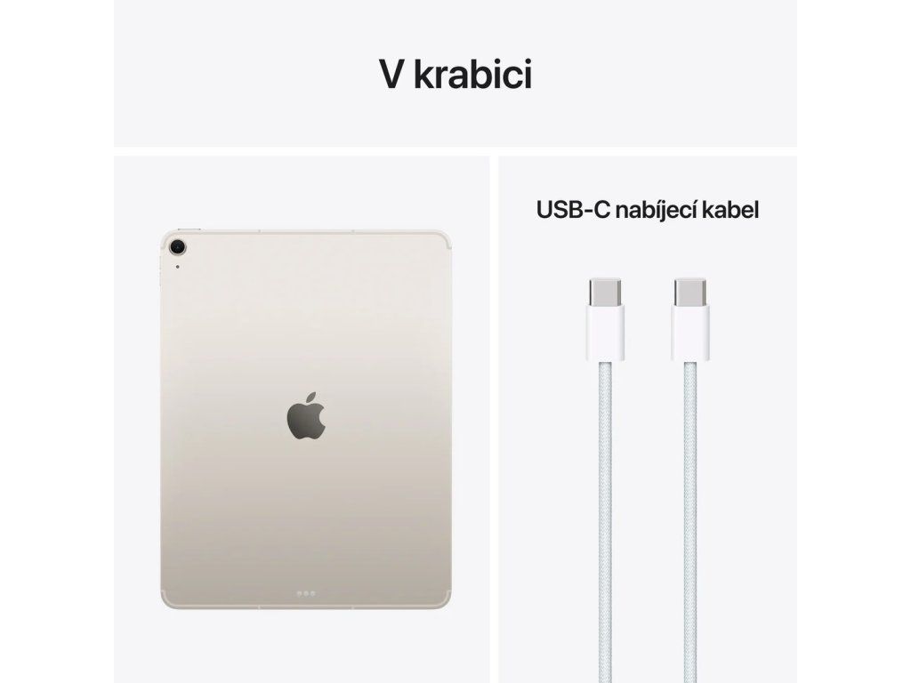 Apple iPad Air 13'' (M4) Wi-Fi + Cellular 512GB *Apple Intelligence Operační systém: iPadOS 26 Procesor: Apple M4, 8 jádrové CPU (3P+5E), 9 jádrové GPU, 16 jádrový Neural Engine Paměť: 12GB Pevný disk: ,512GB Čtečka paměťových karet: ne Displej: 12,9'' Liquid Retina Multi-Touch displej s LED podsvícením a technologií IPS, 2732x2048 při 264ppi, 600 nitů, antireflexní, oleofobní úprava proti šmouhám, True Tone Audio: stereo reproduktory v orientaci na šířku, FaceTime audio, 2x mikrofon Zadní fotoaparát: *12MP širokoúhlý, f/1,8, pětičlenný objektiv, až 5× digitální zoom, Smart HDR 4, sekvenční režim, HEIF a JPEG *4K video při 24 fps, 25 fps, 30 fps nebo 60 fps, kontinuální autofokus při nahrávání videa, HEVC a H.264, časosběrné video se stabilizací Přední webkamera: *12MP Center Stage na šířku, f/2,0, Smart HDR 4 *1080p HD video při 25 fps, 30 fps nebo 60 fps, Retina Flash s True Tone, sekvenční režim, FaceTime Senzory: *Touch ID *tříosý gyroskop *akcelerometr *barometr *snímač okolního osvětlení Určování polohy: *digitální kompas *Wi-Fi *mikrolokalizace iBeacon *GPS/GNSS *mobilní data Bezdrátová komunikace: Wi-Fi 7 (802.11be) s technologií 2×2 MIMO + Bluetooth 6 + 5G (pásma sub-6 GHz) s technologií MIMO 4×4, gigabitové LTE s technologií MIMO 4×4, mobilní modem Apple C1X Porty: *1x USB-C (až 10 Gb/s), nabíjení, DisplayPort *1x magnetický konektor *1x smart konektor Baterie: vestavěná lithium-polymerová baterie s kapacitou 36,59Wh Výdrž baterie: až 10 hodin/až 9 hodin v mobilní datové síti Barva: hvězdně bílá Rozměry: 280,6x214,9x6,1mm Hmotnost: 617g V krabici: *iPad Air *USB-C nabíjecí kabel (1m)Dodatočné parametre