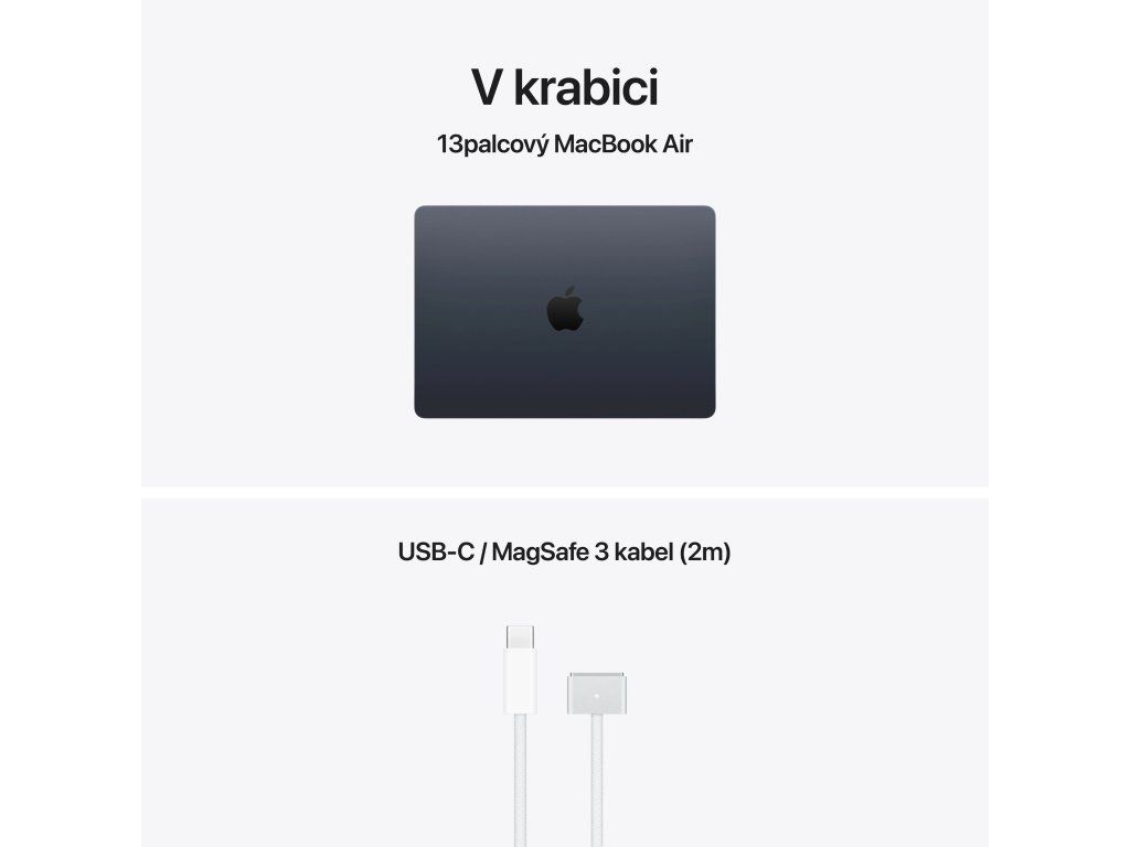 Apple MacBook Air 13'' s čipem M5 *Apple Intelligence Operační systém: macOS Procesor: Apple M5, 10jádrové CPU (4P+6E), 10jádrové GPU, 16jádrový Neural Engine, propustnost paměti 153 GB/s Paměť: 24GB Pevný disk: 1TB SSD Optická mechanika: ne Čtečka paměťových karet: ne Displej: 13,6'' Liquid Retina IPS, 2560×1664 při 224 pixelech na palec, LED podsvícení, 500 nitů, True Tone Audio: 4x reproduktor, Dolby Atmos, 3x mikrofon Webkamera: 12Mpx Center Stage, 1080p HD video Polohovací zařízení: Force Touch trackpad Podsvícená klávesnice: ano Layout klávesnice: CZ Numerická klávesnice: ne Čtečka otisků prstů: Touch ID Síť: ne Bezdrátová komunikace: Wi-Fi 7 (802.11be) + Bluetooth 6 Porty USB: *2x Thunderbolt/USB 4 (nabíjení, DisplayPort, Thunderbolt 4: až 40Gb/s, USB4: až 40Gb/s) Ostatní porty: *1x MagSafe 3 *1x 3,5mm sluchátkový konektor Baterie: vestavěná 66,5Wh lithium-polymerová Výdrž baterie: až 15 hodin bezdrátového prohlížení webu Napájení: napájecí adaptér se prodává zvlášť (minimální příkon potřebný k nabíjení zařízení je 35 W) Barva: temně inkoustová Rozměry: 304,1x215x11,3mm Hmotnost: 1,23kg V krabici: *13'' MacBook Air *USB-C/MagSafe 3 kabel (2m) *CZ návod součástí balení Záruka: 1 rokDodatočné parametre