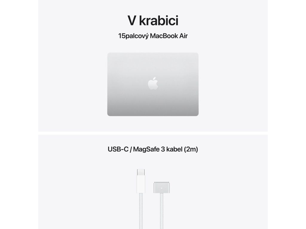 Apple MacBook Air 15'' s čipem M5 *Apple Intelligence Operační systém: macOS Procesor: Apple M5, 10jádrové CPU (4P+6E), 10jádrové GPU, 16jádrový Neural Engine, propustnost paměti 153 GB/s Paměť: 16GB Pevný disk: 1TB SSD Optická mechanika: ne Čtečka paměťových karet: ne Displej: 15,3'' Liquid Retina IPS, 2880×1864 při 224 pixelech na palec, LED podsvícení, 500 nitů, True Tone Audio: 6x reproduktor s wooferem, Dolby Atmos, 3x mikrofon Webkamera: 12Mpx Center Stage, 1080p HD video Polohovací zařízení: Force Touch trackpad Podsvícená klávesnice: ano Layout klávesnice: ,SK Numerická klávesnice: ne Čtečka otisků prstů: Touch ID Síť: ne Bezdrátová komunikace: Wi-Fi 7 (802.11be) + Bluetooth 6 Porty USB: *2x Thunderbolt/USB 4 (nabíjení, DisplayPort, Thunderbolt 4: až 40Gb/s, USB4: až 40Gb/s) Ostatní porty: *1x MagSafe 3 *1x 3,5mm sluchátkový konektor Baterie: vestavěná 66,5Wh lithium-polymerová Výdrž baterie: až 15 hodin bezdrátového prohlížení webu Napájení: napájecí adaptér se prodává zvlášť (minimální příkon potřebný k nabíjení zařízení je 140 W) Barva: stříbrná Rozměry: 340,4x237,6x11,5mm Hmotnost: 1,51kg V krabici: *15'' MacBook Air *USB-C/MagSafe 3 kabel (2m) *SK návod součástí balení Záruka: 1 rokDodatočné parametre