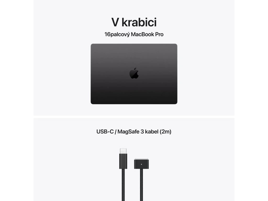 Apple MacBook Pro 16'' s čipem M5 Max *Apple Intelligence Operační systém: macOS Procesor: Apple M5 Max, 18jádrové CPU (6P+12E), 32jádrové GPU, 16jádrový Neural Engine, propustnost 460 GB/s Paměť: 36GB Pevný disk: 2TB SSD Optická mechanika: ne Čtečka paměťových karet: SDXC Displej: 16,2'' Liquid Retina XDR, 3456×2234 při 254 pixelech na palec, XDR až 1000 nitů, až 120Hz, True Tone Audio: Hi-fi zvuková soustava šesti reproduktorů s woofery v antirezonančním uspořádání, Dolby Atmos, soustava tří mikrofonů Webkamera: 12MP Center Stage, 1080p HD video, obrazový signálový procesor s výpočetním videem Polohovací zařízení: Force Touch trackpad Podsvícená klávesnice: ano, snímač okolního osvětlení Layout klávesnice: CZ Numerická klávesnice: ne Čtečka otisků prstů: Touch ID Síť: ne Bezdrátová komunikace: Wi-Fi 7 (802.11be) + Bluetooth 6.0 Porty USB: *3× Thunderbolt 5 (nabíjení, DisplayPort, Thunderbolt 5: až 120 Gb/s, USB 4: až 120 Gb/s) Ostatní porty: *1× MagSafe 3 *1× 3,5mm sluchátkový konektor *1× HDMI *1× slot pro SDXC kartu Baterie: 100Wh lithium-polymerová Výdrž baterie: až 16 hodin bezdrátového prohlížení webu Napájení: napájecí adaptér se prodává zvlášť (minimální příkon potřebný k nabíjení zařízení je 140 W) Barva: vesmírná čerň (Space Black) Rozměry: 355,7×248,1×16,8mm Hmotnost: 2,15kg V krabici: *16'' MacBook Pro *kabel USB-C/MagSafe 3 (2m) *český návodDodatočné parametre