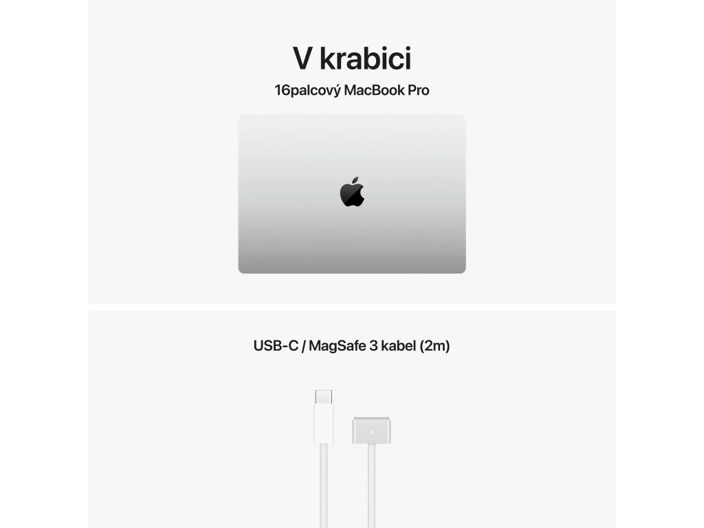 Apple MacBook Pro 16'' s čipem M5 Pro *Apple Intelligence Operační systém: macOS Procesor: Apple M5 Pro, 18jádrové CPU (6P+12E), 20jádrové GPU, 16jádrový Neural Engine, propustnost 307 GB/s Paměť: 48GB Pevný disk: 1TB SSD Optická mechanika: ne Čtečka paměťových karet: SDXC Displej: 16,2'' Liquid Retina XDR, 3456×2234 při 254 pixelech na palec, XDR až 1000 nitů, až 120Hz, True Tone Audio: Hi-fi zvuková soustava šesti reproduktorů s woofery v antirezonančním uspořádání, Dolby Atmos, soustava tří mikrofonů Webkamera: 12MP Center Stage, 1080p HD video, obrazový signálový procesor s výpočetním videem Polohovací zařízení: Force Touch trackpad Podsvícená klávesnice: ano, snímač okolního osvětlení Layout klávesnice: CZ Numerická klávesnice: ne Čtečka otisků prstů: Touch ID Síť: ne Bezdrátová komunikace: Wi-Fi 7 (802.11be) + Bluetooth 6.0 Porty USB: *3× Thunderbolt 5 (nabíjení, DisplayPort, Thunderbolt 5: až 120 Gb/s, USB 4: až 120 Gb/s) Ostatní porty: *1× MagSafe 3 *1× 3,5mm sluchátkový konektor *1× HDMI *1× slot pro SDXC kartu Baterie: 100Wh lithium-polymerová Výdrž baterie: až 17 hodin bezdrátového prohlížení webu Napájení: napájecí adaptér se prodává zvlášť (minimální příkon potřebný k nabíjení zařízení je 140 W) Barva: stříbrná Rozměry: 355,7×248,1×16,8mm Hmotnost: 2,14kg V krabici: *16'' MacBook Pro *kabel USB-C/MagSafe 3 (2m) *český návodDodatočné parametre