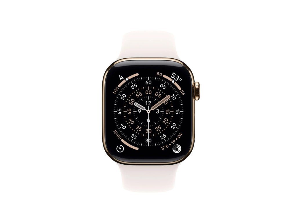 Apple Watch Series 11 Cellular Sport Band zlaté/světleruměné M/L * pro zápěstí s obvodem 130–200 mm * korunka Digital Crown s haptickou odezvou * reproduktor/mikrofon Operační systém: watchOS Displej: stále zapnutý LTPO3 OLED Retina, 374×446 pixelů, 989mm2, 326 ppi, 1/2000 nitů Čip: * S10 s 64bitovým dvoujádrovým procesorem * 4jádrový Neural Engine * 64 GB Připojení: * GPS L1, GLONASS, Galileo, QZSS a BeiDou * LTE a UMTS * Wi-Fi 4 (802.11n) * podpora 2,4GHz a 5GHz Wi-Fi sítí * Bluetooth 5.3 * NFC: Apple Pay, GymKit Snímače: * elektrický snímač srdeční činnosti * třetí generace optického snímače srdeční činnosti * saturace kyslíkem * teploty * hloubkoměr do 6 m * teploty vody * kompas * stále aktivní výškoměr * akcelerometr snímající vysoké přetížení * gyroskop s vysokým dynamickým rozsahem * okolního osvětlení Voděodolnost: do 50 m (pro plavání) Odolnost proti prachu: IP6X Funkce: * aplikace Saturace kyslíkem * aplikace EKG * aplikace Sledování cyklu se zpětným odhadem doby ovulace * aplikace Srdeční tep * oznámení o vysoké a nízké tepové frekvenci * oznámení o nepravidelném srdečním rytmu * aplikace Léky * aplikace Všímavost se zaznamenáváním stavu mysli * aplikace Hluk * aplikace Spánek se sledováním fází spánku * spánkové skóre * upozorňování na spánkovou apnoi * oznámení o hypertenzi * tíseň SOS * mezinárodní tísňové volání * detekce autonehody * detekce pádu * monitorování hluku Kompatibilita: iPhone 11 a novější, včetně iPhonu SE (2. generace a novější) s iOS 26 nebo novějším Napájení: vestavěná dobíjecí lithium-iontová, podpora rychlonabíjení, až 24 hodin běžného používání Materiál pouzdra: titan Rozměry: 42x36x9,7mm Hmotnost: 34,6g Obsah balení: * Apple Watch Series 11 * řemínek * magnetická rychlonabíječka Apple Watch s USB-C kabelem (1m)Dodatočné parametre