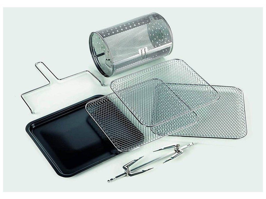 - Príslušenstvo: 3 fritovacie mriežky, plech na pečenie, otořný kôš na vyprážanie, ražeň na kura, rukoväť na vybratie ražňa a otočného koša