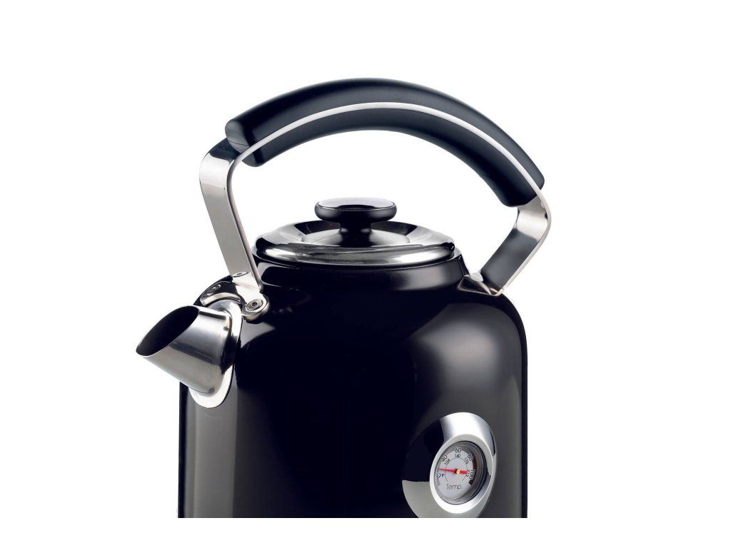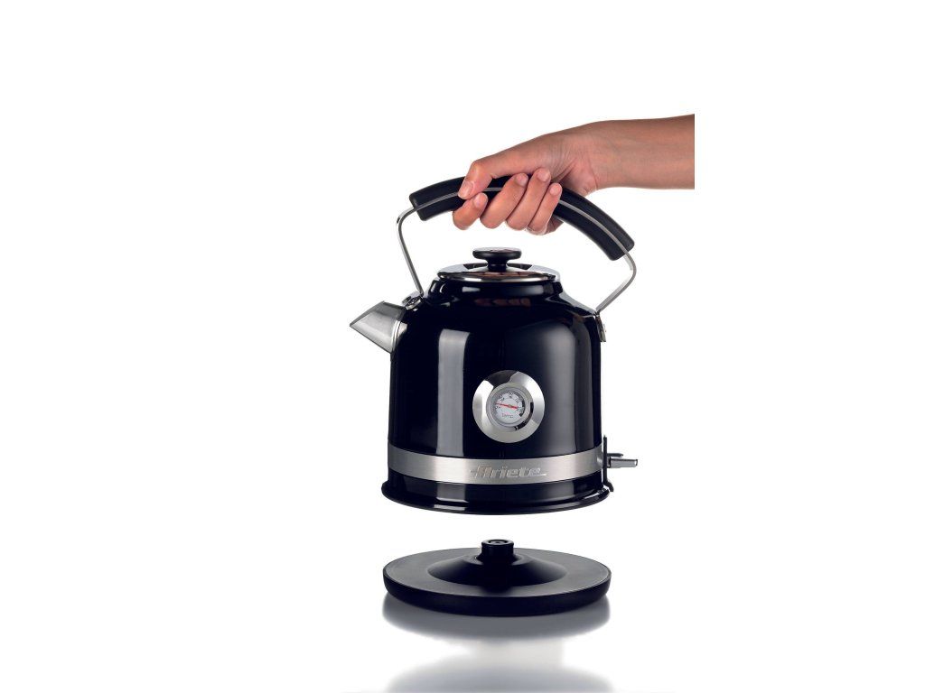 Rýchlovarná kanvica je súčasťou každej domácnosti. Tento retro dizajn z originálnej série Moderna má veľmi kvalitné prevedenie. Elegantné telo v krásnej čiernej farbe a ergonomická rukoväť zaujmú na prvý pohľad a zaistia maximálne pohodlné nalievanie vody. V okamihu, keď voda dosiahne bod varu, dôjde k automatickému vypnutiu. Príjemným bonusom je aj ukazovateľ teploty vody. Pokiaľ totiž chcete pripraviť nápoje, ktoré nevyžadujú 100 stupňovú vodu, máte prehľad, kedy je čas kanvicu vypnúť. Veľkou výhodou je aj 360-stupňový otočný podstavec, čo v praxi znamená pohodlné umiestnenie kanvice na túto základňu z akéhokoľvek uhla. Čierna kanvica naviac disponuje aj vnútorným odnímateľným odvápňovacím filtrom, ktorý jednoducho opláchnete pod tečúcou vodou a zaistíte si vždy čerstvú a čistú vodu.