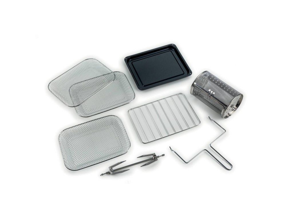 - Bohaté príslušenstvo: 3 oceľové koše, mriežka, odkvapkávací plech, ražeň na kura, otočný kôš na hranolky a rukoväť