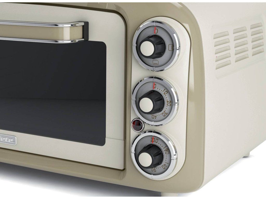Elektrická rúra Ariete Vintage 979 v pastelovej farbe vás očarí nielen svojim jedinečným dizajnovým vzhľadom, ale aj funkciami. Prístroj má objem 18 litrov a ľahko preň nájdete miesto na každej kuchynskej linke. Ovládanie je veľmi jednoduché a ponúka tri funkcie pečenia (horné, spodné, obojstranné) na troch úrovniach od 90 do 230 stupňov. Minútka, ktorú je možné nastaviť až na 60 minút, umožňuje strážiť dĺžku pečenia. Spotrebič skvele poslúži aj ako pec na pizzu (pizza pec), v zadnej časti je totiž vydutá tak, aby sa do nej zmestila pizza s priemerom 30 cm.