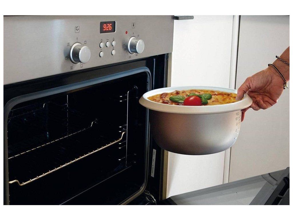 Veľkým plusom je nádoba s nepriľnavým povrchom, ktorá zvládne aj 20-minútový pobyt v rúre rozpálenej na 180-200 °C. Pokiaľ teda chcete ryžovému nákypu dopriať zlatú kôrku navrch, nemusíte špiniť ďalší riad.