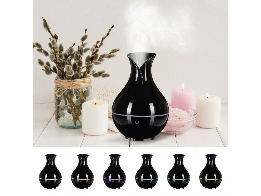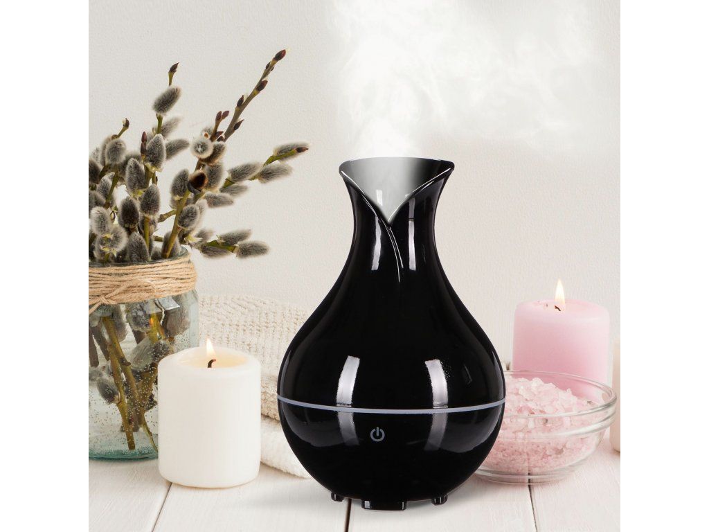 Aróma difúzer Bloom čierny lesk 200mlIdeálny doplnok do vašich domovov, ktorý nádherne prevonia svoje okolie a dokáže vám zlepšiť náladu. Aróma difúzery sú vhodné pre aromaterapiu, chromoterapiu, vzhľadom na svoj dizajn sú aj štýlovým interiérovým doplnkom. Tento prístroj premení vodu na jemnú vodnú paru. Ak pridáte do vody pár kvapiek esenciálneho oleja, aróma difuzér ich pôsobením ultrazvuku rozloží na jemné mikročastice, ktoré prevoňajú váš byt. Aróma difúzer tiež neutralizuje nepríjemné zápachy, napr. od cigaretového dymu alebo domácich zvierat. Tento najnovší model kompaktného difuzéra nevyžaduje na odparovanie vatovú tyčinku.