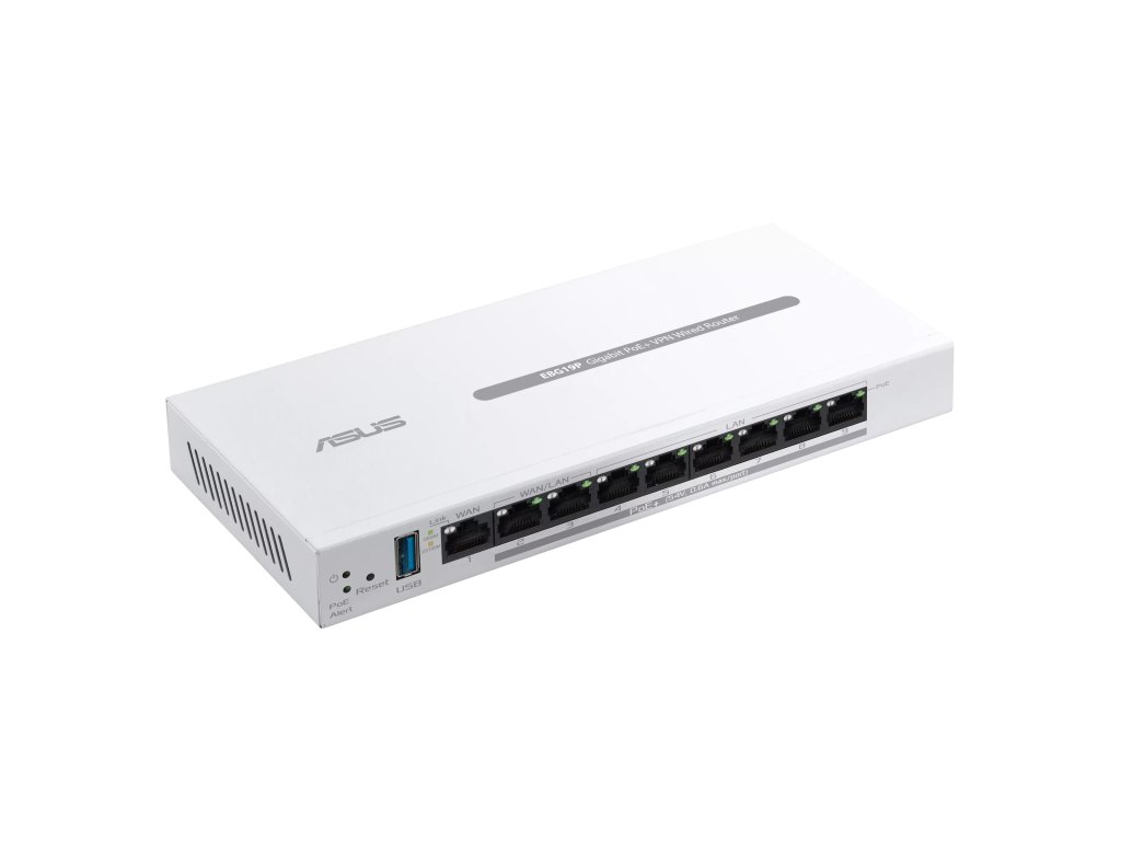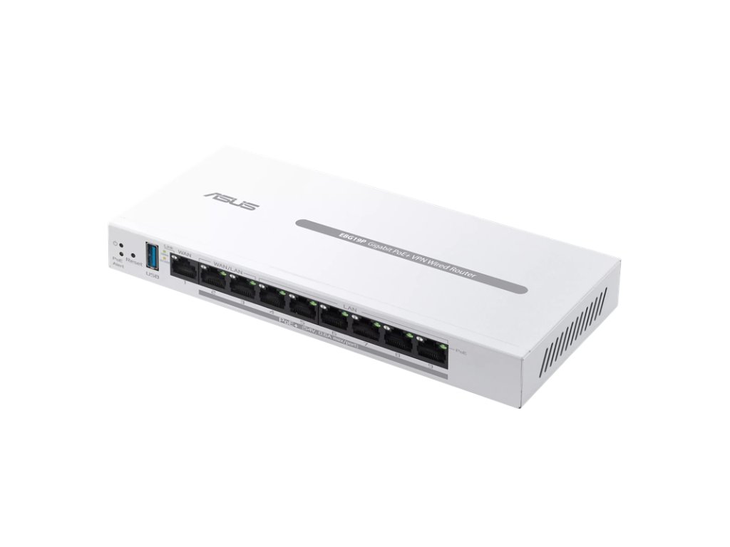 ASUS ExpertWifi EBG19P, VPN ROUTER Model: EBG19P Procesor: 1,8 GHz dvoujádrový ARMv8 Flash paměť: 256 MB RAM: 512 MB Anténa: 1× interní Bluetooth WAN porty: 1× Gigabit LAN porty: 8× Gigabit (2 lze přepnout na WAN) USB: 1× USB 3.2 Gen 1 Tlačítko: Reset LED: Power, PoE Alert Napájení vstup: 110–240 V AC, 50–60 Hz Napájení výstup: 54 V DC, max 2,278 A Rozměry: 212 × 95 × 26 mm Váha: 530 g Síťové standardy: IEEE 802.1p, 802.1q, 802.3, 802.3ab, 802.3i, 802.3u, 802.3x, IPv4, IPv6 Režimy: AiMesh Node, AiMesh Router Funkce: Firewall, VPN, QoS, blokování webů a aplikací, časové schéma, Guest síť, IoT síť, VPN síť Odkaz na oficiální web: https://www.asus.com/networking-iot-servers/business-network-solutions/asus-expertwifi/asus-expertwifi-ebg19p/Dodatočné parametre
