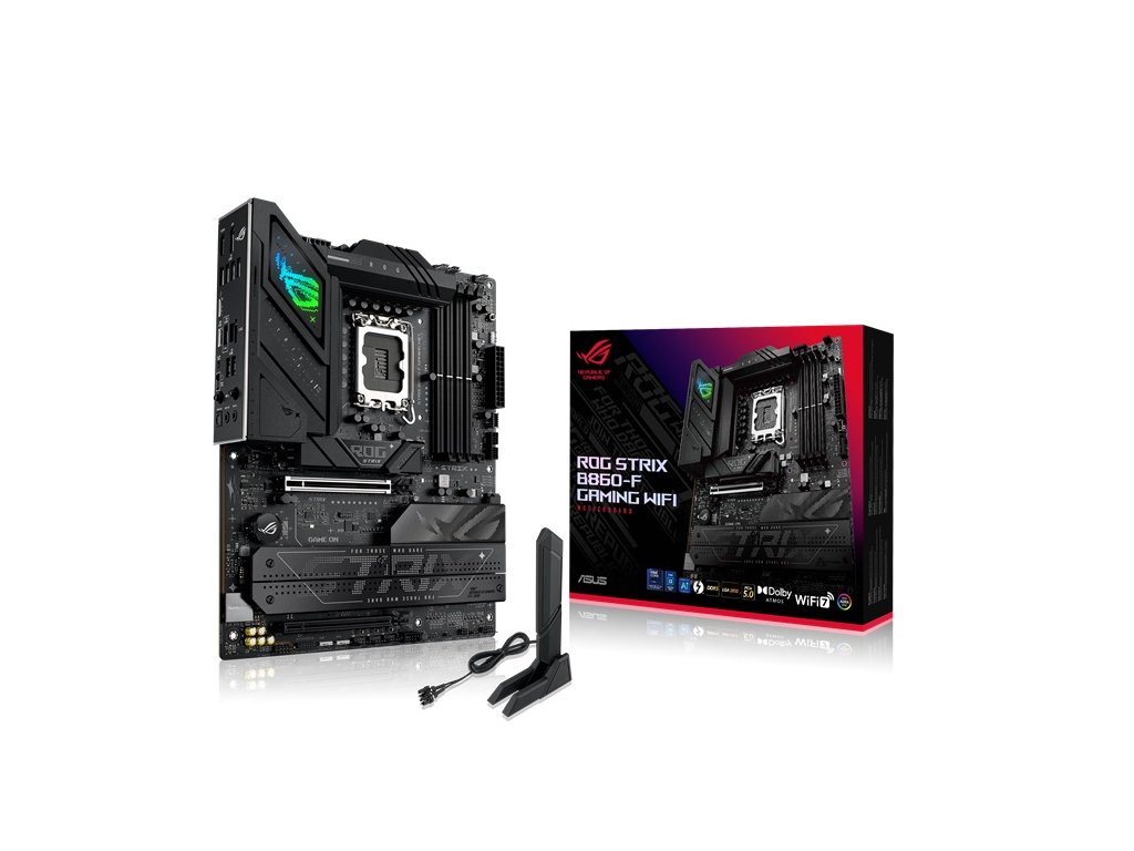 ASUS ROG STRIX B860-F GAMING WIFI * ATX Form Factor CPU: Intel® Socket LGA1851 for Intel® Core™ Ultra Processors(Series 2), Supports Intel® Turbo Boost Technology 2.0 and Intel® Turbo Boost Max Technology 3.0** Chipset: Intel® B860 Chipset Paměť: 4 x sloty DIMM, max. 192 GB, DDR5 - Podpora až 9066MT/s (OC), Non-ECC, Un-buffered ,Clocked Unbuffered DIMM (CUDIMM) *Dvoukanálová paměťová architektura *Podpora paměťového modulu Intel® Extreme Memory Profile (XMP) *Osazení DIMM Grafické porty: *1 x DisplayPort *1 x HDMI™ port *1 x Intel® Thunderbolt™ 4 ports (USB Type-C®) support DisplayPort and Thunderbolt™ video outputs Rozšiřující sloty: Intel® Core™ Ultra Processors(Series 2) *1 x PCIe 5.0 x16 slot (supports x16) Intel® B860 Chipset *1 x PCIe 4.0 x16 slot (supports x4 mode) Úložný prostor: Supports 4 x M.2 slots and 4 x SATA 6Gb/s ports Intel® Core™ Ultra Processors(Series 2) *M.2_1 slot (Key M), type 2242/2260/2280 (supports PCIe 5.0 x4 mode) Intel® B860 Chipset *M.2_2 slot (Key M), type 2280 (supports PCIe 4.0 x4 mode) *M.2_3 slot (Key M), type 2280/22110 (supports PCIe 4.0 x4 mode) *M.2_4 slot (Key M), type 2280 (supports PCIe 4.0 x4 mode) *4 x SATA 6Gb/s ports Ethernet: *1 x Intel® 2.5Gb Ethernet *ASUS LANGuard Připojení a Bluetooth: *Wi-Fi 7 *2x2 Wi-Fi 7 (802.11be) *Supports 2.4/5/6GHz frequency band *Supports Wi-Fi 7 160MHz bandwidth, up to 2.9Gbps transfer rate. *Bluetooth® v5.4 USB: Zadní USB (Total 7 ports) *1 x Thunderbolt™ 4 port (1 x USB Type-C®) *1 x USB 20Gbps port (1 x USB Type-C®) *1 x USB 10Gbps ports (1 x Type-A) *6 x USB 5Gbps ports (6 x Type-A) Přední USB (Total 7 ports) *1 x USB 10Gbps (1 x USB Type-C®) *1 x USB 5Gbps header support 2 additional USB 5Gbps ports *2 x USB 2.0 headers support 3 additional USB 2.0 ports Audio: ROG SupremeFX 7.1 Surround Sound High Definition Audio CODEC ALC4080 *SupremeFX Shielding Technology *Savitech SV3H712 AMP *Rear optical S/PDIF out port *Premium audio capacitors *Audio cover Vstupy/výstupy zadního panelu: *1 x Thunderbolt™ 4 (1 x USB Type-C®) *1 x USB 20Gbps port (1 x USB Type-C®) *1 x USB 10Gbps port (1 x Type-A) *6 x USB 5Gbps ports (6 x Type-A) *1 x DisplayPort *1 x HDMI™ port *1 x Wi-Fi module *1 x Intel® 2.5Gb Ethernet port *2 x audio jacks *1 x Optical S/PDIF out port *1 x BIOS FlashBack™ button *1 x Clear CMOS button Interní vstupy/výstupy: Ventilátory a chlazení: *1 x 4-pin CPU Fan header *1 x 4-pin CPU OPT Fan header *1 x 4-pin AIO Pump header *4 x 4-pin Chassis Fan headers Napájení: *1 x 24-pin Main Power connector *2 x 8-pin +12V CPU Power connectors Úložiště: *4 x M.2 slots (Key M) *4 x SATA 6Gb/s ports USB: *1 x USB 10Gbps connector (supports USB Type-C® ) *1 x USB 5Gbps header support 2 additional USB 5Gbps ports *2 x USB 2.0 headers support 3 additional USB 2.0 ports Různé: *3 x Addressable Gen2 headers *1 x Chassis Intrusion header *1 x Front Panel Audio header (F_AUDIO) *1 x Start button *1 x 10-1 pin Front System Panel header *1 x Thermal Sensor header *1 x Thunderbolt™ (USB4®) header Příslušenství: Kabely: *2 x SATA 6Gb/s cables Různé: *1 x ASUS WiFi Q-Antenna *1 x Cable ties package *1 x M.2 Q-Latch package *1 x M.2 Q-Slide package *1 x ROG key chain *1 x ROG Strix stickers *4 x M.2 rubbers Dokumenty: *1 x Quick start guideDodatočné parametre