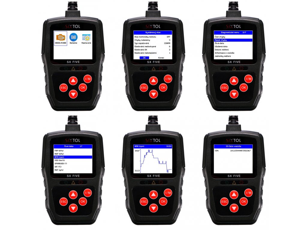 Autodiagnostika SX FIVESX FIVE je praktické diagnostické zariadenie, vďaka ktorému môžete vykonávať diagnostiku svojho vozidla iba pomocou skladného ručného prístroja. Zariadenie disponuje niekoľkými praktickými prednosťami, medzi ktoré patrí farebný displej, jednoduché ovládanie, použitie na širokej škále vozidiel, ergonomický a robustný dizajn a kompaktná veľkosť. Všetky chybové hlášky, ktoré prístroj číta (závady z riadiacej jednotky motora) sú uvedené v slovenčine, a to vrátane špecifických chýb, ktoré táto diagnostika dokáže v elektronike motora u vybraných automobilov identifikovať.