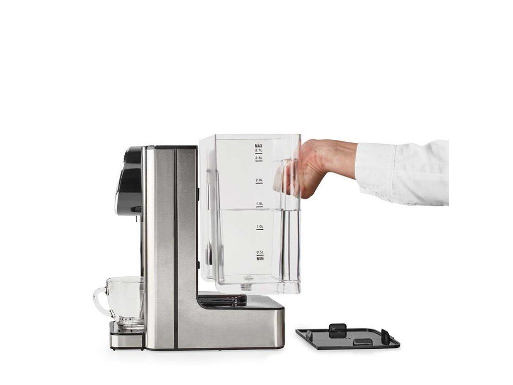 Zařízení je vybaveno vyjímatelným zásobníkem na vodu a odkapávacím táckem, což usnadňuje plnění i čištění. Pokud se v zásobníku objeví nedostatek vody nebo dojde k vytvoření vodního kamene, zařízení vás automaticky upozorní. A s výškou pod vývodem až 16 cm se pod něj pohodlně vejdou i větší hrnky a nádoby. Tento moderní automat na horkou vodu je navržen tak, aby splňoval všechny vaše požadavky na komfortní a efektivní přípravu horkých nápojů.
