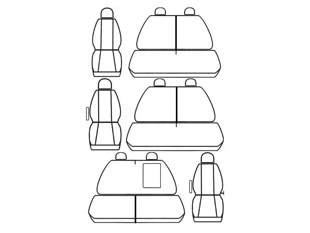 - 2. ŘADA: Samostatné sklopné opěradlo a sedadlo + dvojopěradlo dělené napůl a nedělené dvojsedadlo, otvory na pásy v opěradlech, 3 opěrky hlavy. Vhodné i pro model s loketní opěrkou v druhé řadě.