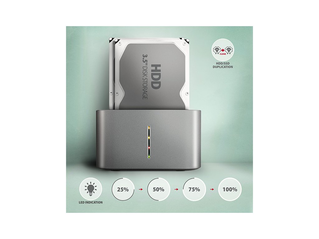 SuperSpeed USB-C 5Gbps dokovací / klonovací stanice AXAGON ADSA-DC DUAL CLONE připojí k počítači snadno a rychle až dva 2.5'' nebo 3.5'' disky současně. Připojení k počítači umožňuje moderní oboustranný USB-C konektor na doku spolu s dodávaným kabelem USB-C <-> USB-A o délce 80 cm. Tento šikovný pomocník vám tak umožní nejjednodušší připojení 2.5''/3.5'' SATA disků k počítači nebo notebooku. Jeden nebo i dva disky současně jen stačí zasunout do základny, nejsou potřeba žádné nástroje ani doplňky. Výměna disků je tak velmi rychlá a jednoduchá. Dokovací stanici také využijete pro snadné klonování obsahu připojených disků bez potřeby připojení k PC. Do prvního slotu stanice HDD A (source) zasunete zdrojový disk a do druhého slotu HDD B (target) zasunete cílový disk. Pak jen zmáčknete klonovací tlačítko a sledujete průběh klonování na stupnici čtyř LED diod. Po zkopírování všech dat je na cílovém disku přesná kopie původního disku. Dock tak lze využít jako autonomní zařízení pro pohodlné duplikování a vytváření obrazů disků. Jedná se o nejjednodušší způsob, jak přenést obsah starého HDD disku na nový SSD disk, a to včetně funkčního operačního systému (Windows, macOS, Linux …). Rozhraní SATA 6G s podporou UASP dovolí užívat si rychlost moderních SSD disků. Podpora funkce TRIM pro omezení pozvolné degradace výkonu SSD v čase. Stanice umožňuje čtení S.M.A.R.T. informací monitorujících kondici HDD/SSD. Podporuje usínání připojených disků i stanice. Skříň stanice je dostatečně robustní a odolná, což umožňuje dokonalou stabilitu i s vloženými disky. Gumové nožky omezují posouvání po stole a vibrace pevných disků. Vnější plášť je proveden z hliníku s elegantním broušeným povrchem. Vstup: • USB-C 5Gbps (USB 3.2 Gen 1 / USB 3.0). • Rychlost až 5 Gbit/s. • Připojení přes USB-C female konektor. Podpora zařízení: • Rozhraní SATA III - 6 Gb/s (600 MB/s). • Podpora 2.5'' HDD/SSD • Podpora 3.5'' HDD. • Max. kapacita disku - všechny bez omezení. • Max. výška 2.5'' disku - všechny bez omezení. Vlastnosti: • Kompatibilní s USB 3.2 Gen 2 (USB 3.1 Gen 2) a zpětně kompatibilní s USB 2.0. • Podpora přenosových rychlostí 5000 / 480 Mbit/s. • Vyhovuje Serial ATA 3.0 specifikaci (SATA/600), přenosové rychlosti až 6 Gb/s (600 MB/s). • Vyhovuje Serial ATA 2.0 specifikaci (SATA/300), přenosové rychlosti až 3 Gb/s (300 MB/s). • Vyhovuje Serial ATA 1.0 specifikaci (SATA/150), přenosové rychlosti až 1.5 Gb/s (150 MB/s). • Celková propustnost / přenosová rychlost stanice je dána použitým USB rozhraním (teor. 5 Gbit/s). • Vyhovuje USB Mass Storage Class specifikaci. • Podpora BOT (Bulk-Only Transport). • Podpora UASP (USB Attached SCSI Protocol) pro rychlejší přenos dat ve Windows 8 a novějších. • Podpora funkce TRIM pro omezení pozvolné degradace výkonu SSD v čase. • Podpora S.M.A.R.T. (Self-Monitoring, Analysis, and Reporting Technology) systém monitorující stav disku. • Podpora bootování z HDD/SSD v dokovací stanici. • Možnost připojení zařízení za chodu díky podpoře Hot Plug. • Plná podpora Plug and Play. • HDD Auto Spin down - vypínání disků při nečinnosti. • HDD Turn Off - vypnutí disku po odebrání zařízení nebo uspání PC. • Připojení přes USB-C female konektor. • Kabel USB-C <-> USB-A délky 80 cm je součástí balení. • LED indikující napájení HDD/SSD docku a aktivitu disků v obou šachtách. • Rozměry stanice 130 x 97 x 73 mm. • Hmotnost 307 g. Napájení: • Napájení pomocí přiloženého externího AC/DC adapteru 12V – 2.5A (30W) s kabelem délky 150 cm. • Vypínač napájení. Funkce klonování obsahu disku: • Klonování probíhá bez připojení stanice k počítači. • Cílový disk musí mít stejnou nebo větší kapacitu jako disk zdrojový, jinak nelze klonování spustit. • Klonovat lze jak pevné disky HDD tak SSD. • Rychlost klonování SSD až 300 MB/s. • Celkový čas naklonování disku závisí na kapacitě zdrojového disku, ne na objemu dat na disku. Podporované operační systémy: • Windows, macOS, Linux, Chrome OS. Balení v kartonové krabičce obsahuje: • HDD/SSD dock, • USB-C <-> USB-A kabel délky 80 cm, • napájecí adapter 100-240V / 12V-2.5A, • vícejazyčný návod CZ/DE/DK/ENG/ESP/FIN/FR/GR/HR/HU/IT/NL/PL/PT/RO/RU/SK/SWE/BG/CN/TR/ARA.Dodatočné parametre