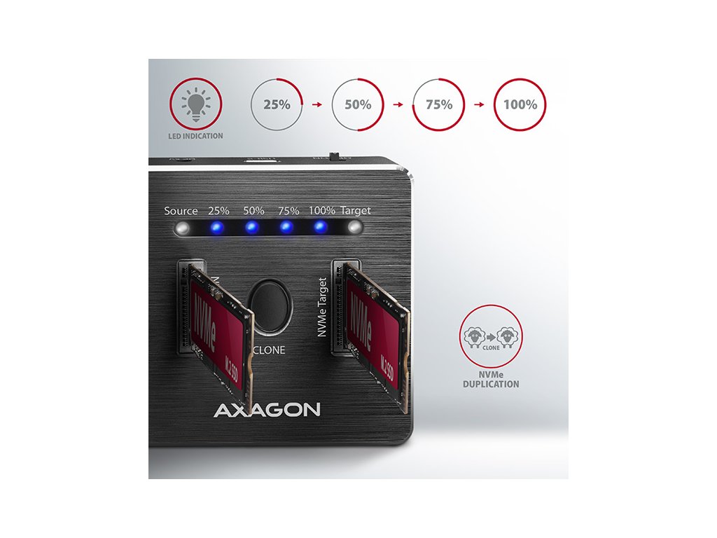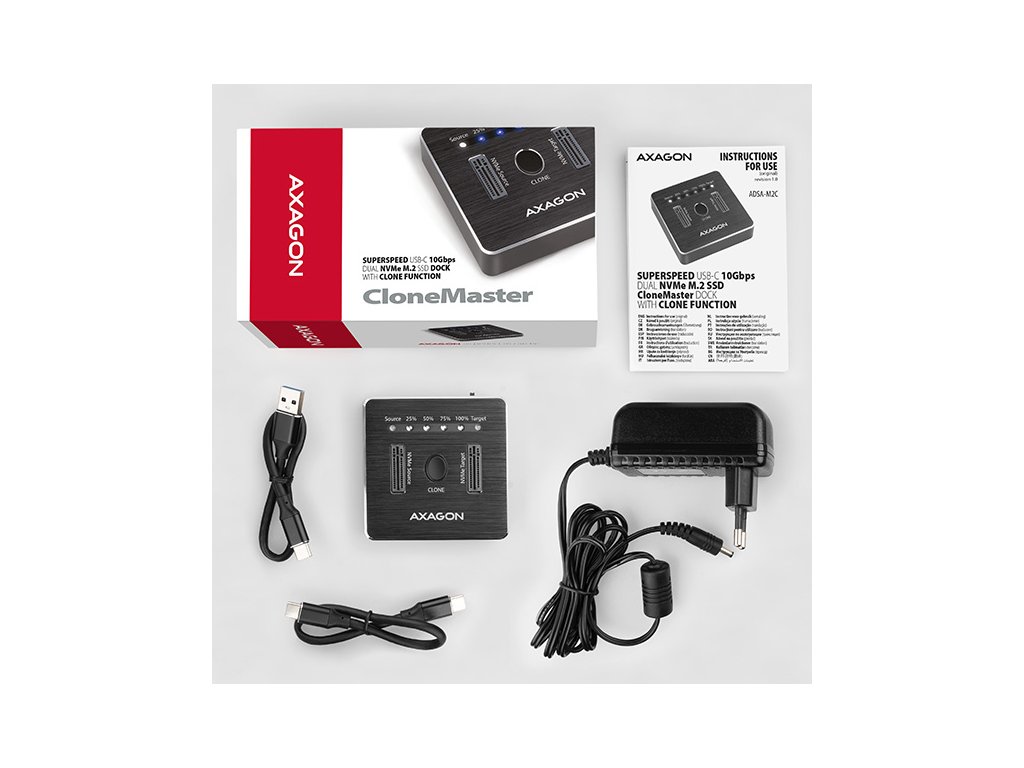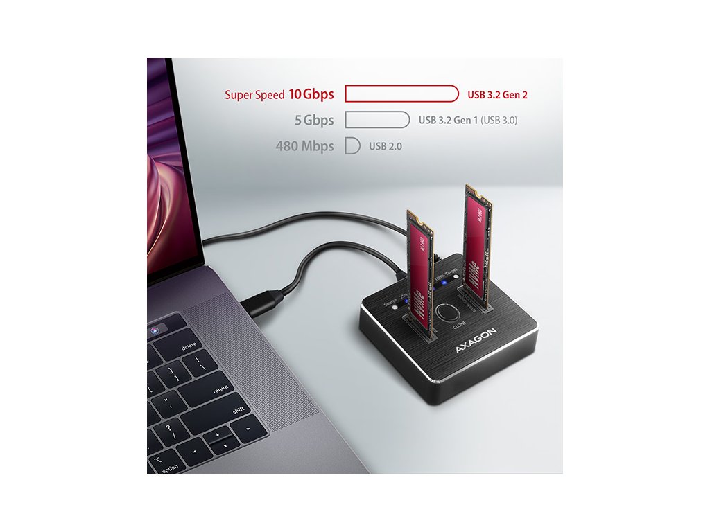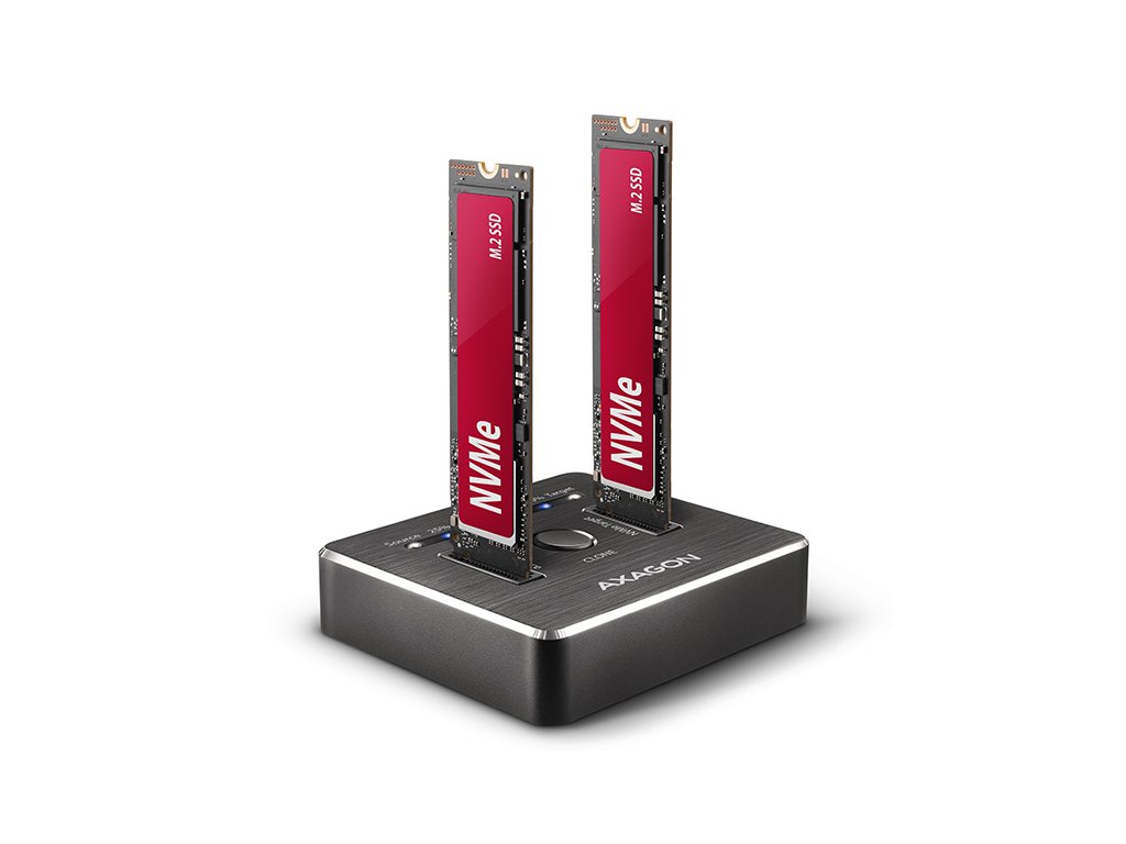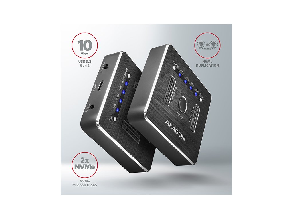 SuperSpeed USB-C 10 Gbps dokovací stanice AXAGON ADSA-M2C DUAL NVMe CLONE MASTER DOCK připojí k počítači snadno a rychle až dva NVMe (PCI-Express) M.2 SSD disky. Pohodlné připojení umožňuje oboustranný USB-C konektor. V balení naleznete rovnou dva kabely pro připojení dokovací stanice - klasický kabel USB-C -> USB-A a také USB-C -> USB-C kabel. Tento malý pomocník vám umožní nejjednodušší a nejrychlejší způsob připojení až dvou libovolných NVMe M.2 SSD disků k počítači. M.2 kartu jen vezmete a zasunete do základny, nejsou potřeba žádné nástroje ani doplňky. Výměna M.2 SSD disků je tak velmi rychlá a lehká. Dokovací stanici také využijete pro snadné klonování obsahu připojených NVMe disků bez potřeby připojení k PC. Do prvního slotu stanice (source) zasunete zdrojový M.2 disk a do druhého slotu (target) zasunete cílový M.2 disk. Pak jen zmáčknete klonovací tlačítko a sledujete průběh klonování na stupnici ze čtyř LED diod. Po zkopírování všech dat je na cílovém disku přesná kopie původního M.2 disku. Dock tak lze využít jako autonomní zařízení pro pohodlné duplikování a vytváření obrazů disků. Jedná se o nejjednodušší způsob, jak přenést obsah jednoho SSD disku na další SSD disk, a to včetně funkčního operačního systému (Windows, macOS, Linux …). Rychlé rozhraní USB 3.2 Gen 2 a podpora NVMe Express s podporou UASP dovolí užívat si rychlost moderních NVMe M.2 SSD disků. Stanice podporuje funkci TRIM pro omezení pozvolné degradace výkonu SSD v čase a umožňuje čtení S.M.A.R.T. informací monitorujících kondici připojených disků. Robustní tělo stanice je vyrobeno z hliníku v moderním designu. Nízko položené těžiště dokovací stanice zajišťuje dobrou stabilitu. Gumové nožky omezují posouvání po stole. Vstup: • USB 3.2 Gen 2 (USB 3.1 Gen 2) SuperSpeed USB 10 Gbps s rychlostí až 10 Gbit/s. • Připojení přes USB type C female konektor. Podpora zařízení: • NVMe (PCI-Express) M.2 SSD jedno i oboustranné disky, • bez omezení kapacity disku, • podpora M.2 disků o rozměrech 2230, 2242, 2260, 2280, 22110 mm, • podpora M-KEY & B+M-KEY NVMe M.2 SSD disků, • NGFF 75-pinový M-key slot pro NVMe M.2 disky. Funkce klonování obsahu disku: • Klonování probíhá bez připojení stanice k počítači. • Cílový disk musí mít stejnou nebo větší kapacitu než disk zdrojový, jinak nelze klonování spustit. • Rychlost klonování SSD až 1000 MB/s. • Celkový čas naklonování disku závisí na kapacitě zdrojového disku, ne na objemu dat na disku. Další vlastnosti: • Kompatibilní s USB 3.2 Gen 2, zpětně kompatibilní s USB 3.2 Gen 1 (USB 3.0) a USB 2.0. • Podpora přenosových rychlostí 10.000 / 5000 / 480 Mbit/s (SuperSpeed+ / SuperSpeed / HighSpeed). • Vyhovuje PCI Express Base Specification Revision 3.1a specifikaci. • Vyhovuje NVM Express 1.3c specifikaci. • Vyhovuje USB Mass Storage Class specifikaci. • Celková propustnost / přenosová rychlost stanice je dána použitým USB 3.2 Gen 2 rozhraním (teoreticky až 10 Gbit/s). • Reálná propustnost / přenosová rychlost stanice kolem 1000 MB/s (1 GB/s) je dána limity USB 3.2 Gen 2 rozhraní. • Podpora UASP (USB Attached SCSI) pro rychlejší přenos dat ve Windows 8 a novějších. • Podpora funkce TRIM pro omezení pozvolné degradace výkonu SSD v čase. • Podpora bootování z SSD. • Plná podpora Plug and Play. • Připojení přes USB 3.2 Gen 2 type C female konektor. • Kabel USB type C male / USB type C male délky 25 cm je součástí balení. • Kabel USB type C male / USB type A male délky 25 cm je součástí balení. • Hliníkové tělo s integrovaným závažím pro lepší stabilitu a gumové nožky zamezují posouvání na stole. • Rozměry stanice 68 x 68 x 17 mm. • Hmotnost 94 g. Napájení: • Napájení pomocí přiloženého externího AC/DC adaptéru 5V - 3A s kabelem délky 150 cm. • Vypínač napájení. LED indikace: • 2x bílá LED dioda u každého disku indikuje připojení disku (trvalým svitem) a přenos dat (blikáním). • 4x modrá LED dioda indikující průběh klonování 25%-50%-75%-100% (blikáním), resp. dokončení klonování (trvalým svitem). Podporované operační systémy: • MS Windows 7 / 8.1 / 10 /11 a novější, Windows Server 2008 / 2012 / 2016 / 2019 a novější (podporovány všechny 32- i 64-bitové verze OS Windows), Mac OS X 10.x a vyšší, Linux s jádrem 2.6.x a vyšším. Pozn.: Ovladače jsou obvykle součástí podporovaných operačních systémů. Při použití s Windows 7 je nutné ověřit u výrobce M.2 SSD disku podporu tohoto OS a dostupnost ovladače. Balení v kartónové krabičce obsahuje: • NVMe dock, • napájecí adaptér 100-240V / 5V/3A, • USB-C <-> USB-A kabel 25 cm, • USB-C <-> USB-C kabel 25 cm, • multijazyčný manuál CZ/DE/DK/ENG/ESP/FIN/FR/GR/HR/HU/IT/NL/PL/PT/RO/RU/SK/SWE/BG/CN/TR/ARA.Dodatočné parametre
