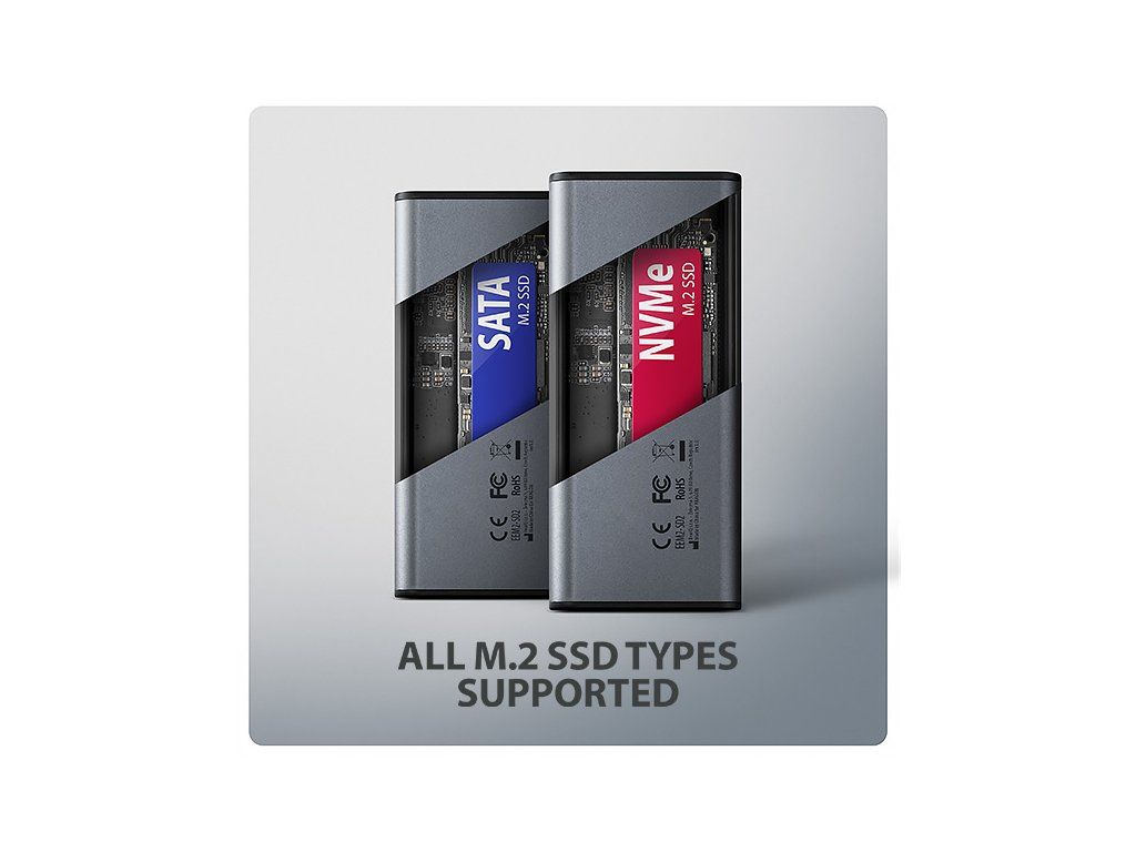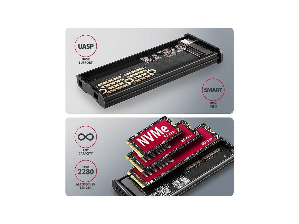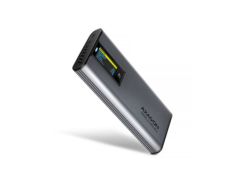 AXAGON EEM2-SD2 10Gbps USB-C - M.2 NVMe & SATA SSD kovový DISPLAY box, bezskrutkový