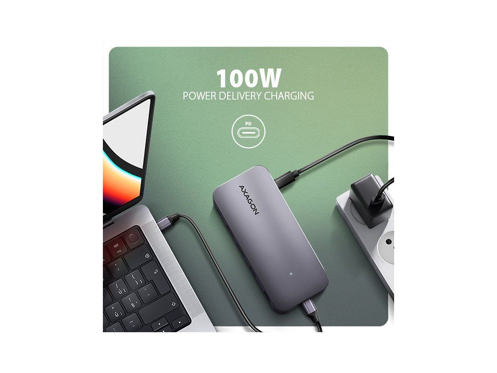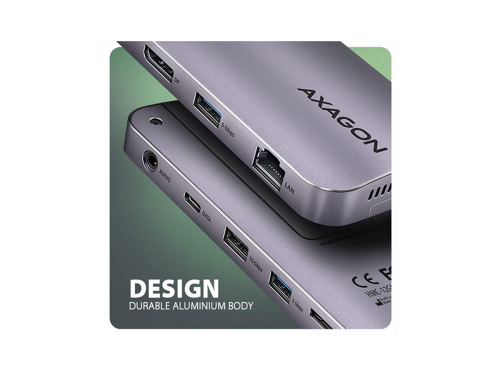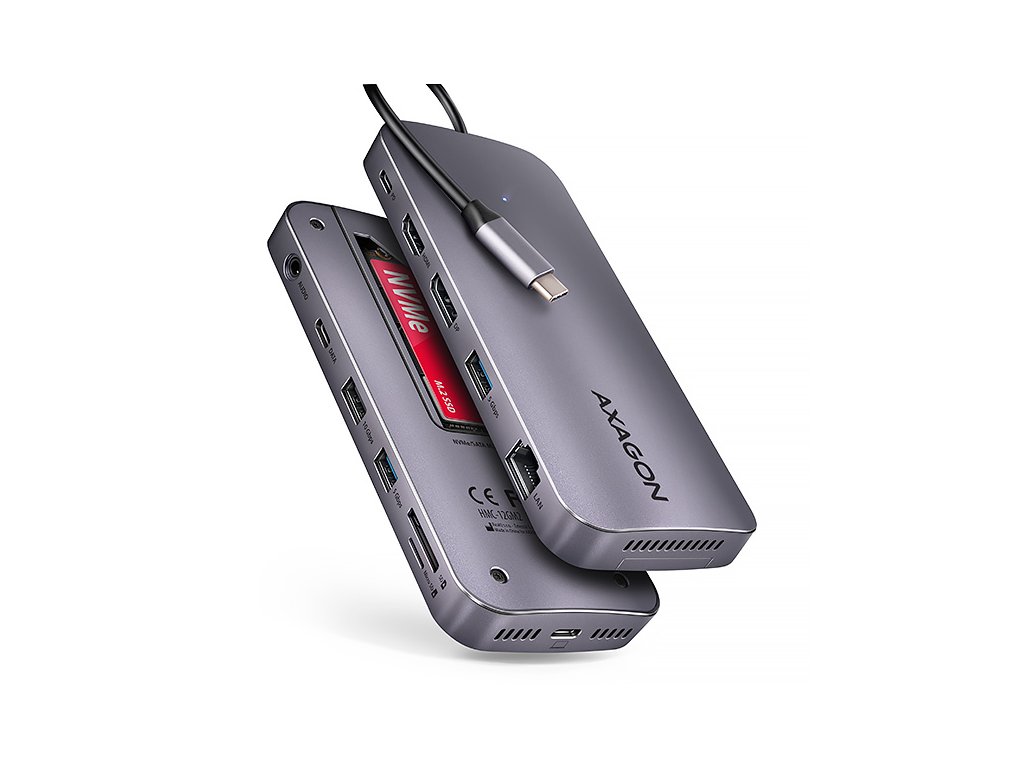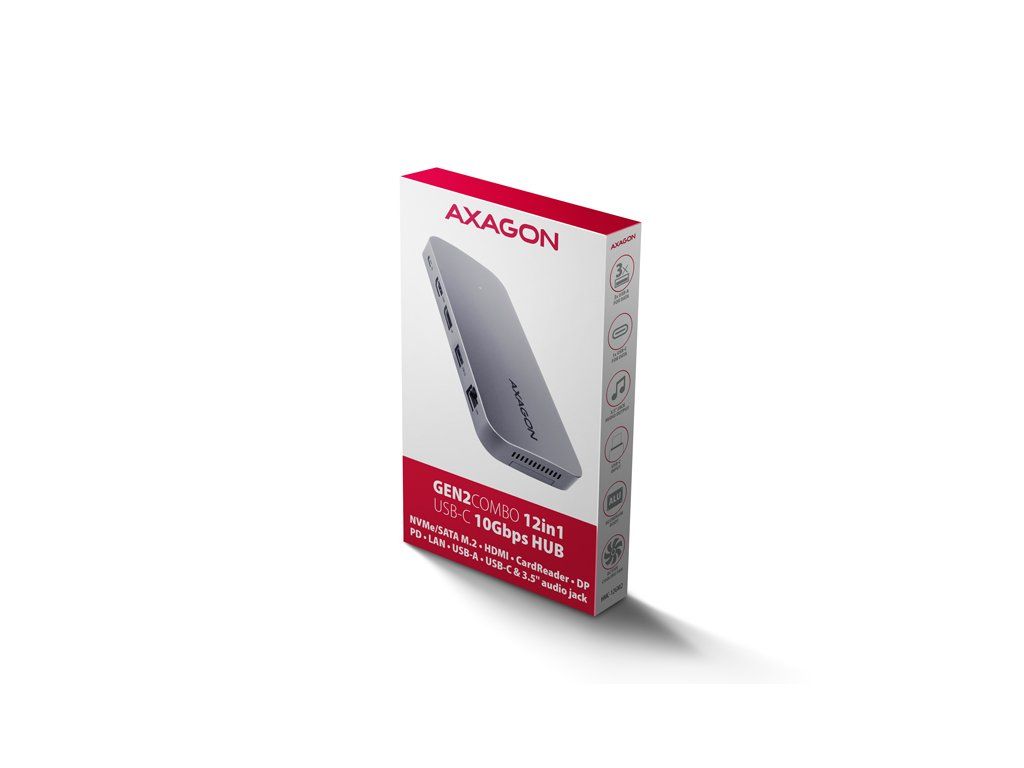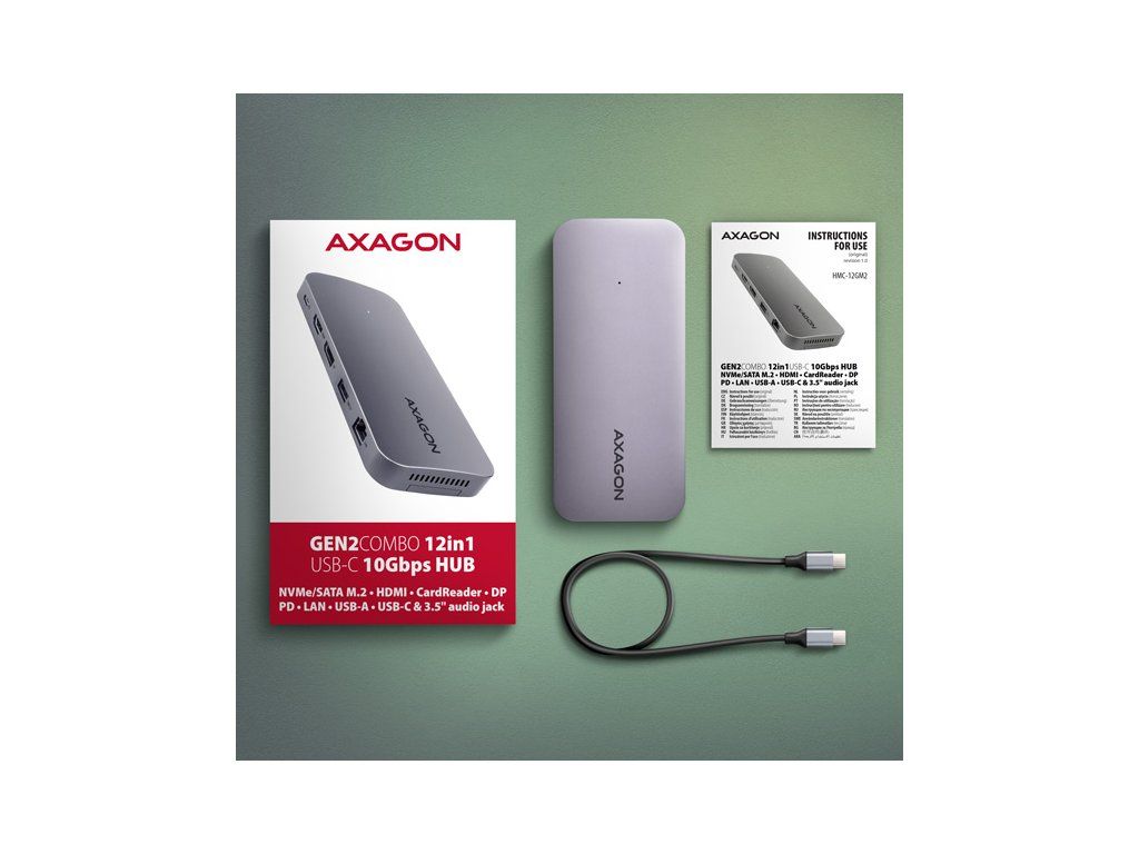 Multiportový USB-C 10Gbps hub AXAGON HMC-12GM2 GEN2COMBO 12in1 rozšíří Váš notebook, počítač nebo telefon o jedenáct portů a externí box pro M.2 disk. Přes oboustranný USB-C konektor snadno a rychle připojíte k počítači až dva monitory, čtyři USB zařízení, Gigabitovou ethernet síť, sluchátka, čtečku SD karet a NVMe nebo SATA M.2 SSD disk. Zároveň získáte možnost napájení notebooku pomocí technologie Power Delivery. USB-C hub vám tak poskytne jednoduchou a skladnou dokovací stanici 12v1 k notebooku jako je například Apple MacBook Air nebo Pro. USB rozbočovač nabízí tři USB výstupy se standardním USB-A konektorem. Dva s rychlostí 5Gbps a třetí s rychlostí 10Gbps pro náročnější zařízení. Dále nabízí i USB-C 10Gbps datový konektor. Hub také zvládne trvalé připojení dvou externích disků současně. Díky rychlému USB 3.2 Gen 2 rozhraní je přenosová rychlost hubu až 10Gb/s. Druhý USB-C konektor je vyhrazen pouze pro nabíjení telefonů nebo notebooků pomocí technologie Power Delivery 3.0 výkonem až 100W. Do hubu zapojíte vhodnou USB-C Power Delivery nabíječku a hub připojíte k notebooku s podporou Power Delivery. Tím také uvolníte jeden USB-C port. HDMI a DisplayPort výstupy poskytují kvalitní obraz. Ať při použití samostatně nebo současně, nabízí porty rozlišení až 4K/60Hz Ultra HD a podporují přenos vícekanálového zvuku. Podporovány jsou také vysoké frekvence v oblíbených hráčských rozlišeních 2K/144Hz nebo FullHD/240Hz. Díky podpoře HDR (vysoce dynamický rozsah) si můžete bez omezení vychutnat výrazně rozšířený rozsah barev a kontrastů. Pro správné fungování video výstupů je nutné, aby notebook měl USB-C port s podporou DisplayPort Alternate Mode (DP Alt Mode) nebo port Thunderbolt 3 a výše. NVME nebo SATA M.2 SSD disk připojíte díky vestavěnému slotu na zadní straně. Multiport hub se tímto stává i externím diskem. Karty M.2 mohou být jednostranné nebo oboustranné o rozměrech 22x42 mm a 22x80 mm. Externí M.2 úložiště nemá omezení kapacity SSD disků a podporuje moderní funkce např. TRIM, UASP a umožňuje čtení S.M.A.R.T. informací monitorujících stav disku. Gigabitová síťová karta rozšíří počítač o rychlé a stabilní síťové připojení, doplní chybějící síťový RJ-45 Ethernet konektor, nebo přidá další síťovou kartu. Čtečka karet podporuje všechny verze SD a microSD karet včetně SDXC a microSDXC s kapacitou až 2TB. Díky vysokorychlostnímu USB rozhraní maximálně využijete potenciál moderních paměťových karet. Card reader umožňuje současnou práci s kartami v obou slotech a přímé kopírování mezi nimi. Elegantní hliníkové tělo zajistí nejen mechanickou odolnost, ale i pasivní chlazení. O aktivní chlazení se postará tichý integrovaný ventilátor, který chladí jak M.2 disk tak samotné tělo hubu. Potěší také jemně strukturovaný povrch, na kterém nezůstávají otisky prstů. Replikátor portů je ideálním doplňkem pro notebooky s nedostatkem USB konektorů, paměti anebo video výstupů. USB-C kabel o délce 50 cm je odpojitelný a lze jej tak v případě potřeby nahradit delším kabelem. V hubu lze využít Vaše stávající USB periferie bez nutnosti pořizování nových. Díky funkcím Plug and Play a Hot Plug je samotné zapojení hubu velmi jednoduché bez složité instalace, a také lze jednoduše připojovat a odpojovat periferie za běhu počítače. Rozbočovač se nezalekne ani připojení k telefonům s USB-C konektorem. K telefonu tak připojíte například flash disk, klávesnici, myš, monitor, TV nebo projektor. Vstup: • USB 10Gbps (USB 3.2 Gen2). • Kompatibilní s Thunderbolt 3/4. • Připojení přes reverzibilní USB type C female konektor. Výstupy USB: • 1x USB 10Gbps port, konektor USB-A female. • 2x USB 5Gbps port, konektor USB-A female. • 1x USB 10Gbps port, konektor USB-C female. • 1x USB Power Delivery 100W port (jen napájení), konektor USB-C female. • USB-C hub zvládne připojení dvou externích disků současně. Výstupy video: • 1x HDMI port, konektor HDMI A female. • 1x DP port, konektor DisplayPort female. Rozlišení a vlastnosti videa: • Maximální podporované rozlišení při zapojení každého z portů samostatně 4K / 4096 x 2160 při 60 Hz. • 2 současně připojené monitory - až 4K/60Hz na obou monitorech. • Pro správnou funkci video výstupu je nutné hub zapojit do USB-C portu s podporou DisplayPort Alternate Mode (DP Alt Mode) verze 1.4 a výš, nebo do USB-C portu s podporou Thunderbolt 3/4. Dále je nutný vhodný OS. Bez této podpory nebude funkce video výstupu dostupná. • Podpora HDR (High dynamic range, 10 bit support) - realistická reprodukce světlých a tmavých detailů. • Podpora HPD (Hot-Plug-Detect). • Podpora TMDS (Transition Minimized Differential Signaling). • Plná podpora HDCP 1.4 a 2.3 (High-bandwidth Digital Content Protection). • Podpora až 8kanálového LPCM zvuku, komprimovaného audia (AC-3, DTS) a HBR audio formátů. • Podpora vzorkovací frekvence až 192 kHz a až 24bitového zvuku – závisí na zdrojovém a koncovém zařízení, tj. notebooku/telefonu a TV/monitoru/AV receiveru. Power Delivery: • Podpora Power Delivery 3.0 - průchozí napájení zařízení ze síťového adaptéru přes USB-C hub. • Maximální výkon napájení přes PD USB-C vstup hubu 100W - 20V/5A. • Nutná podpora PD ze strany zařízení (notebooku, telefonu) a vhodný PD síťový adaptér. Čtečka karet - dva sloty: • Slot Micro SD: microSD / microSDHC / microSDXC / TransFlash. • Slot SD: SecureDigital / SDHC / SDXC, MultiMedia Card, MMC 4.0, MMC Dual Voltage, MMC mobile, RS-MMC, s adaptérem - miniSD, microSD / microSDHC / microSDXC, MMC Micro. Čtečka podporuje tyto specifikace flash karet: • SD 1.0/1.1 (SD - Secure Digital, a