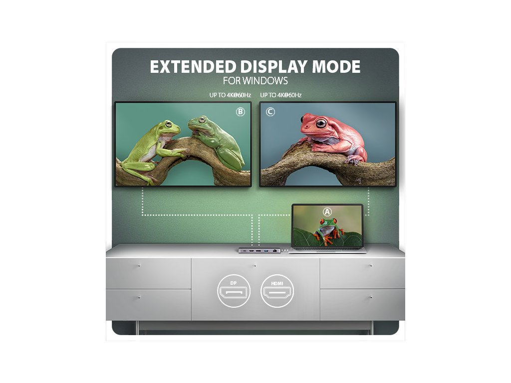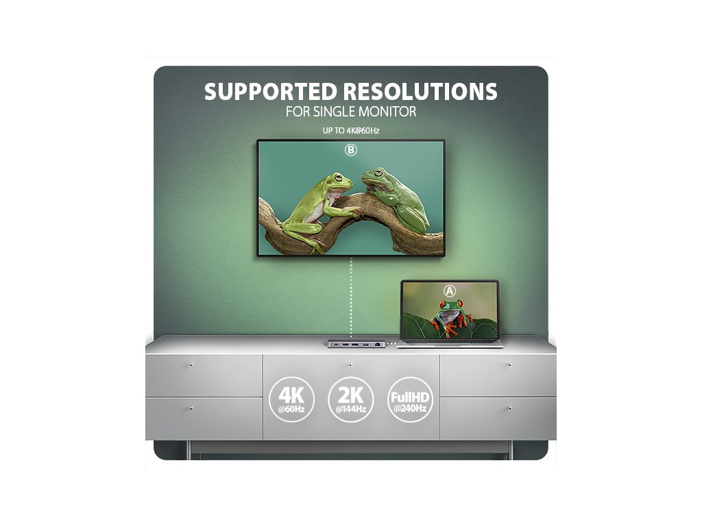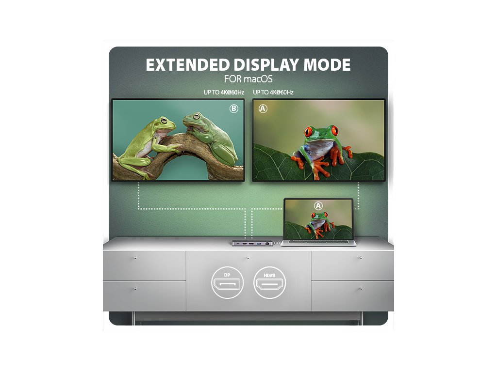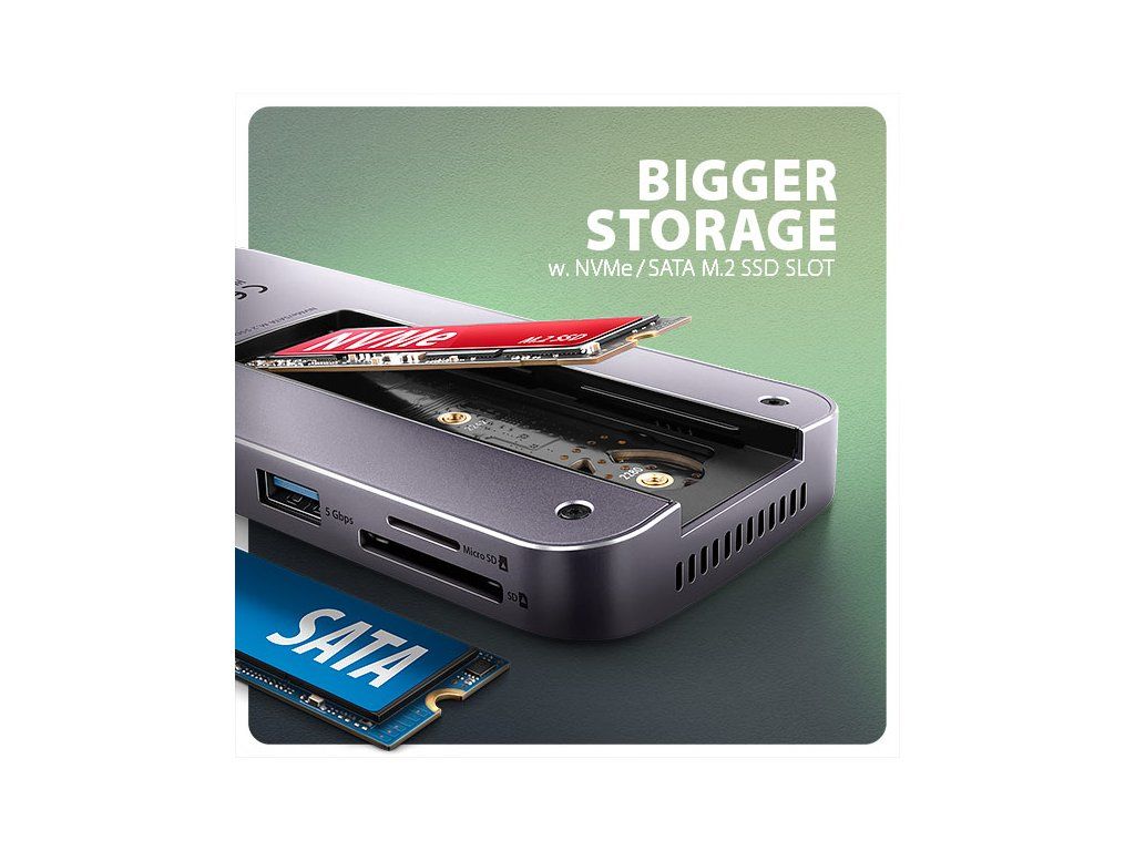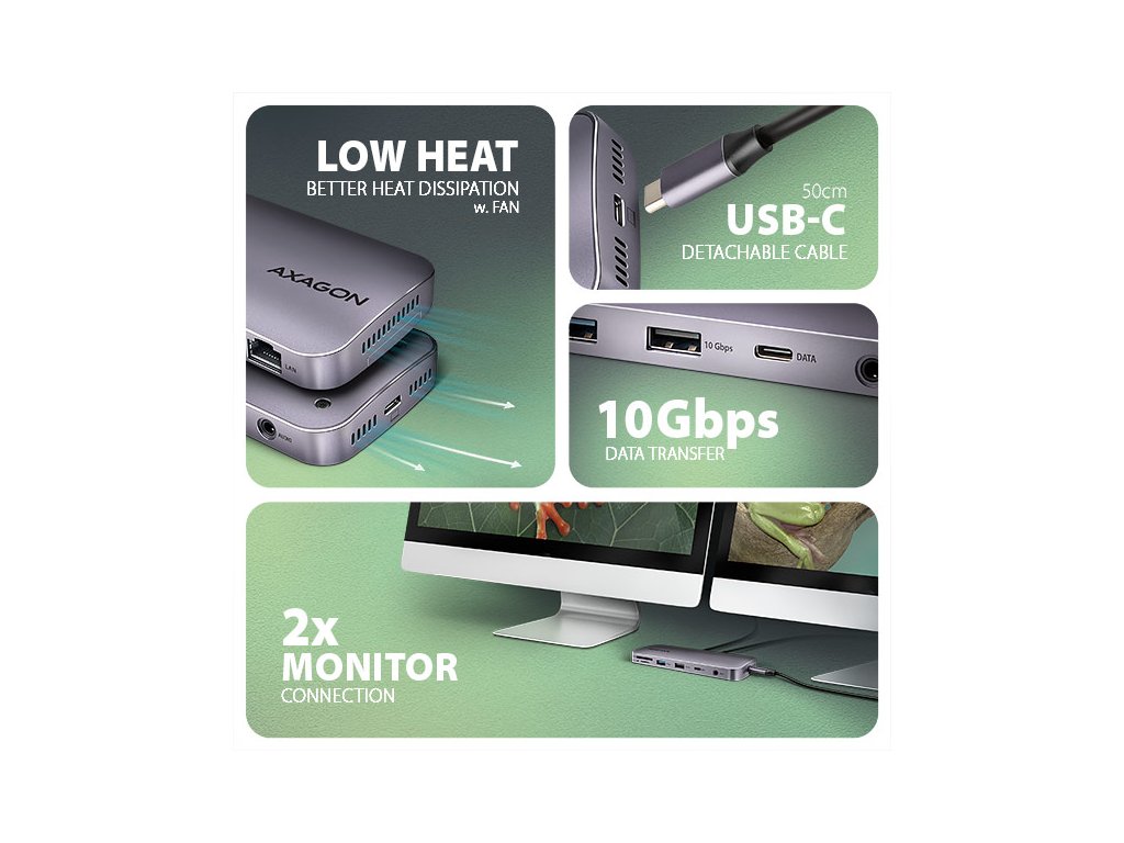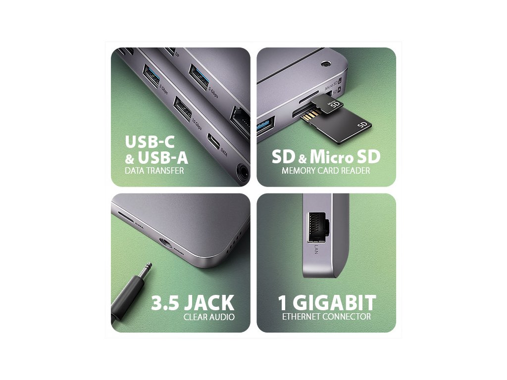 Multiportový USB-C 10Gbps hub AXAGON HMC-12GM2 GEN2COMBO 12in1 rozšíří Váš notebook, počítač nebo telefon o jedenáct portů a externí box pro M.2 disk. Přes oboustranný USB-C konektor snadno a rychle připojíte k počítači až dva monitory, čtyři USB zařízení, Gigabitovou ethernet síť, sluchátka, čtečku SD karet a NVMe nebo SATA M.2 SSD disk. Zároveň získáte možnost napájení notebooku pomocí technologie Power Delivery. USB-C hub vám tak poskytne jednoduchou a skladnou dokovací stanici 12v1 k notebooku jako je například Apple MacBook Air nebo Pro. USB rozbočovač nabízí tři USB výstupy se standardním USB-A konektorem. Dva s rychlostí 5Gbps a třetí s rychlostí 10Gbps pro náročnější zařízení. Dále nabízí i USB-C 10Gbps datový konektor. Hub také zvládne trvalé připojení dvou externích disků současně. Díky rychlému USB 3.2 Gen 2 rozhraní je přenosová rychlost hubu až 10Gb/s. Druhý USB-C konektor je vyhrazen pouze pro nabíjení telefonů nebo notebooků pomocí technologie Power Delivery 3.0 výkonem až 100W. Do hubu zapojíte vhodnou USB-C Power Delivery nabíječku a hub připojíte k notebooku s podporou Power Delivery. Tím také uvolníte jeden USB-C port. HDMI a DisplayPort výstupy poskytují kvalitní obraz. Ať při použití samostatně nebo současně, nabízí porty rozlišení až 4K/60Hz Ultra HD a podporují přenos vícekanálového zvuku. Podporovány jsou také vysoké frekvence v oblíbených hráčských rozlišeních 2K/144Hz nebo FullHD/240Hz. Díky podpoře HDR (vysoce dynamický rozsah) si můžete bez omezení vychutnat výrazně rozšířený rozsah barev a kontrastů. Pro správné fungování video výstupů je nutné, aby notebook měl USB-C port s podporou DisplayPort Alternate Mode (DP Alt Mode) nebo port Thunderbolt 3 a výše. NVME nebo SATA M.2 SSD disk připojíte díky vestavěnému slotu na zadní straně. Multiport hub se tímto stává i externím diskem. Karty M.2 mohou být jednostranné nebo oboustranné o rozměrech 22x42 mm a 22x80 mm. Externí M.2 úložiště nemá omezení kapacity SSD disků a podporuje moderní funkce např. TRIM, UASP a umožňuje čtení S.M.A.R.T. informací monitorujících stav disku. Gigabitová síťová karta rozšíří počítač o rychlé a stabilní síťové připojení, doplní chybějící síťový RJ-45 Ethernet konektor, nebo přidá další síťovou kartu. Čtečka karet podporuje všechny verze SD a microSD karet včetně SDXC a microSDXC s kapacitou až 2TB. Díky vysokorychlostnímu USB rozhraní maximálně využijete potenciál moderních paměťových karet. Card reader umožňuje současnou práci s kartami v obou slotech a přímé kopírování mezi nimi. Elegantní hliníkové tělo zajistí nejen mechanickou odolnost, ale i pasivní chlazení. O aktivní chlazení se postará tichý integrovaný ventilátor, který chladí jak M.2 disk tak samotné tělo hubu. Potěší také jemně strukturovaný povrch, na kterém nezůstávají otisky prstů. Replikátor portů je ideálním doplňkem pro notebooky s nedostatkem USB konektorů, paměti anebo video výstupů. USB-C kabel o délce 50 cm je odpojitelný a lze jej tak v případě potřeby nahradit delším kabelem. V hubu lze využít Vaše stávající USB periferie bez nutnosti pořizování nových. Díky funkcím Plug and Play a Hot Plug je samotné zapojení hubu velmi jednoduché bez složité instalace, a také lze jednoduše připojovat a odpojovat periferie za běhu počítače. Rozbočovač se nezalekne ani připojení k telefonům s USB-C konektorem. K telefonu tak připojíte například flash disk, klávesnici, myš, monitor, TV nebo projektor. Vstup: • USB 10Gbps (USB 3.2 Gen2). • Kompatibilní s Thunderbolt 3/4. • Připojení přes reverzibilní USB type C female konektor. Výstupy USB: • 1x USB 10Gbps port, konektor USB-A female. • 2x USB 5Gbps port, konektor USB-A female. • 1x USB 10Gbps port, konektor USB-C female. • 1x USB Power Delivery 100W port (jen napájení), konektor USB-C female. • USB-C hub zvládne připojení dvou externích disků současně. Výstupy video: • 1x HDMI port, konektor HDMI A female. • 1x DP port, konektor DisplayPort female. Rozlišení a vlastnosti videa: • Maximální podporované rozlišení při zapojení každého z portů samostatně 4K / 4096 x 2160 při 60 Hz. • 2 současně připojené monitory - až 4K/60Hz na obou monitorech. • Pro správnou funkci video výstupu je nutné hub zapojit do USB-C portu s podporou DisplayPort Alternate Mode (DP Alt Mode) verze 1.4 a výš, nebo do USB-C portu s podporou Thunderbolt 3/4. Dále je nutný vhodný OS. Bez této podpory nebude funkce video výstupu dostupná. • Podpora HDR (High dynamic range, 10 bit support) - realistická reprodukce světlých a tmavých detailů. • Podpora HPD (Hot-Plug-Detect). • Podpora TMDS (Transition Minimized Differential Signaling). • Plná podpora HDCP 1.4 a 2.3 (High-bandwidth Digital Content Protection). • Podpora až 8kanálového LPCM zvuku, komprimovaného audia (AC-3, DTS) a HBR audio formátů. • Podpora vzorkovací frekvence až 192 kHz a až 24bitového zvuku – závisí na zdrojovém a koncovém zařízení, tj. notebooku/telefonu a TV/monitoru/AV receiveru. Power Delivery: • Podpora Power Delivery 3.0 - průchozí napájení zařízení ze síťového adaptéru přes USB-C hub. • Maximální výkon napájení přes PD USB-C vstup hubu 100W - 20V/5A. • Nutná podpora PD ze strany zařízení (notebooku, telefonu) a vhodný PD síťový adaptér. Čtečka karet - dva sloty: • Slot Micro SD: microSD / microSDHC / microSDXC / TransFlash. • Slot SD: SecureDigital / SDHC / SDXC, MultiMedia Card, MMC 4.0, MMC Dual Voltage, MMC mobile, RS-MMC, s adaptérem - miniSD, microSD / microSDHC / microSDXC, MMC Micro. Čtečka podporuje tyto specifikace flash karet: • SD 1.0/1.1 (SD - Secure Digital, a
