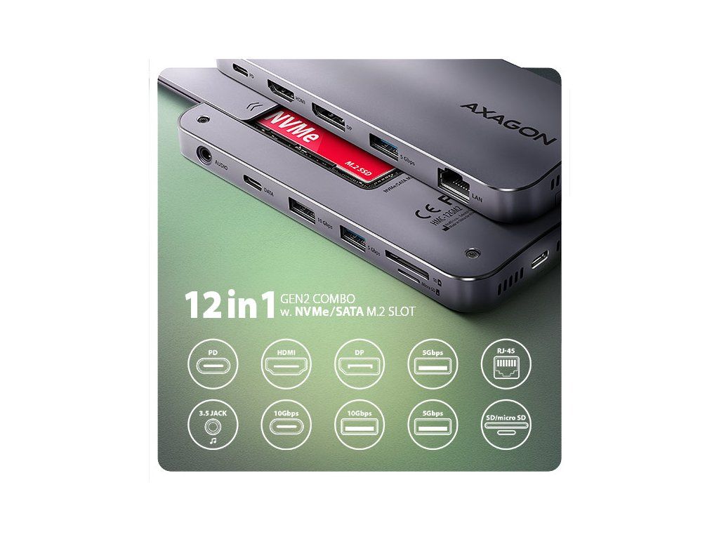 AXAGON HMC-12GM2, USB 10Gbps hub, 3x USB-A, USB-C, HDMI, DP, RJ-45 GLAN, M.2, SD/mSD, audio, PD